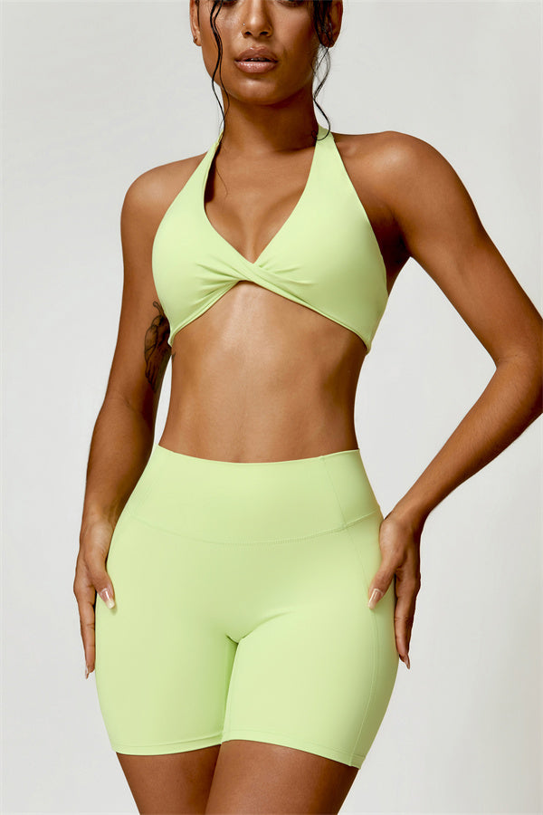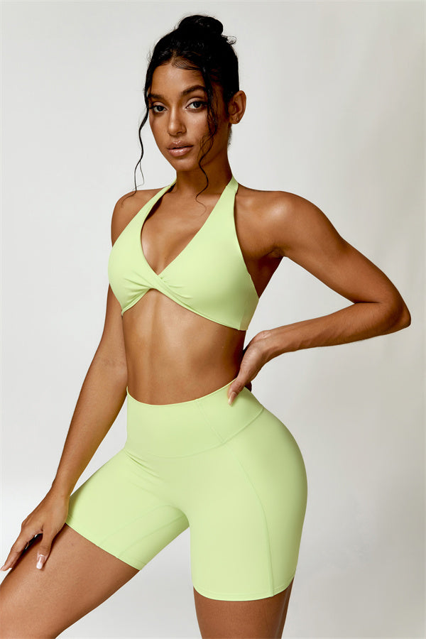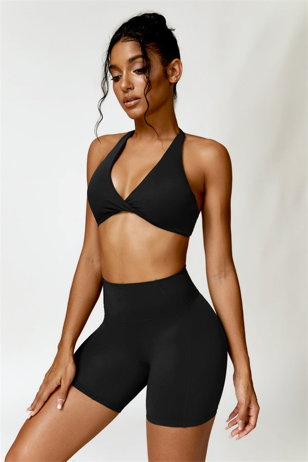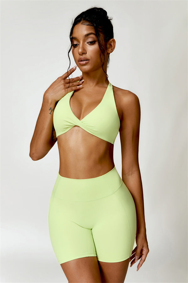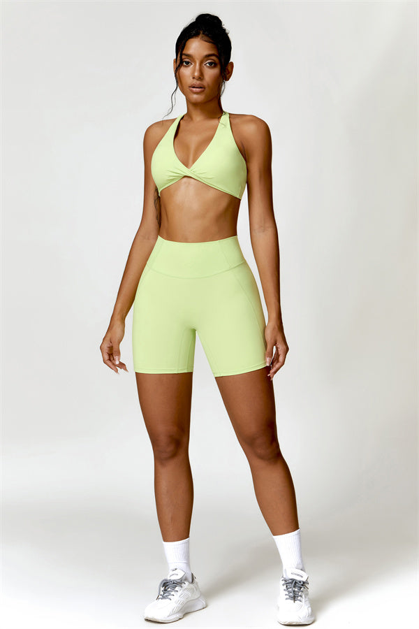 This matching set, featuring a sports bra and shorts, combines sensual style with high-performance functionality. The front twist design adds a touch of elegance, while the flattering booty contour ensures a fuller, more rounded shape. Crafted from a soft, cloud-like fabric (78% recycled nylon, 22% spandex), the set is durable, breathable, and moisture-wicking to keep you comfortable through your most intense workouts.