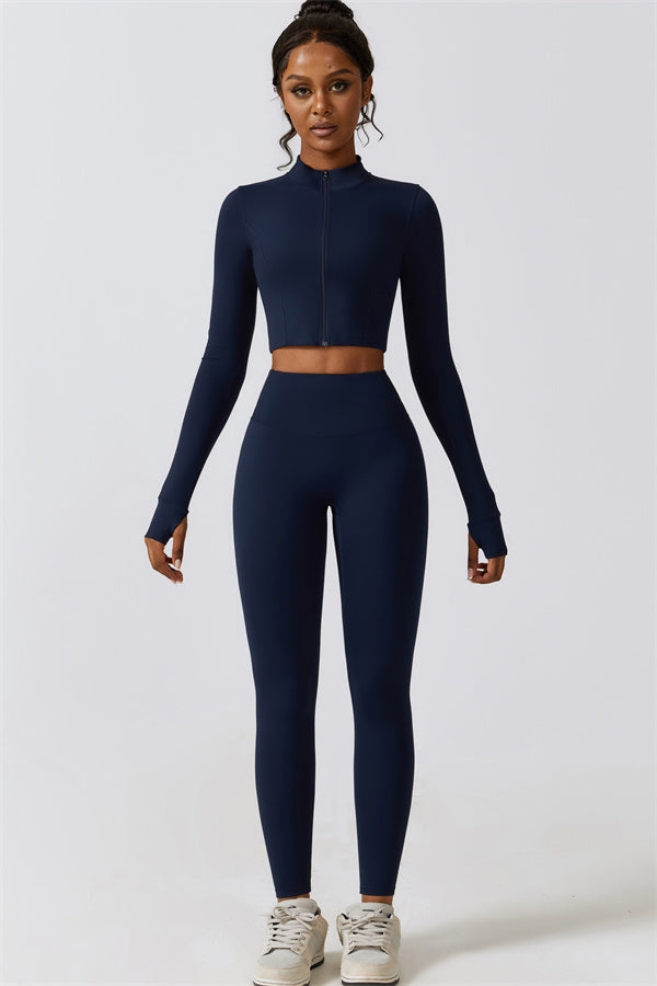 This matching set, including a sports bra, jacket, and leggings, is designed to elevate your performance and style. The sports bra features curved seams along the front, enhancing and supporting your shape with a flattering, natural lift. The leggings are engineered with a back ruching detail that effortlessly contours to create a peachy, sculpted look. Crafted from durable, resilient fabric, this set is built to keep its shape, offering maximum flexibility and resistance to wear.