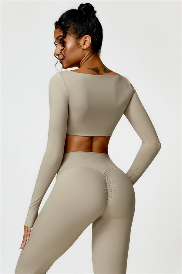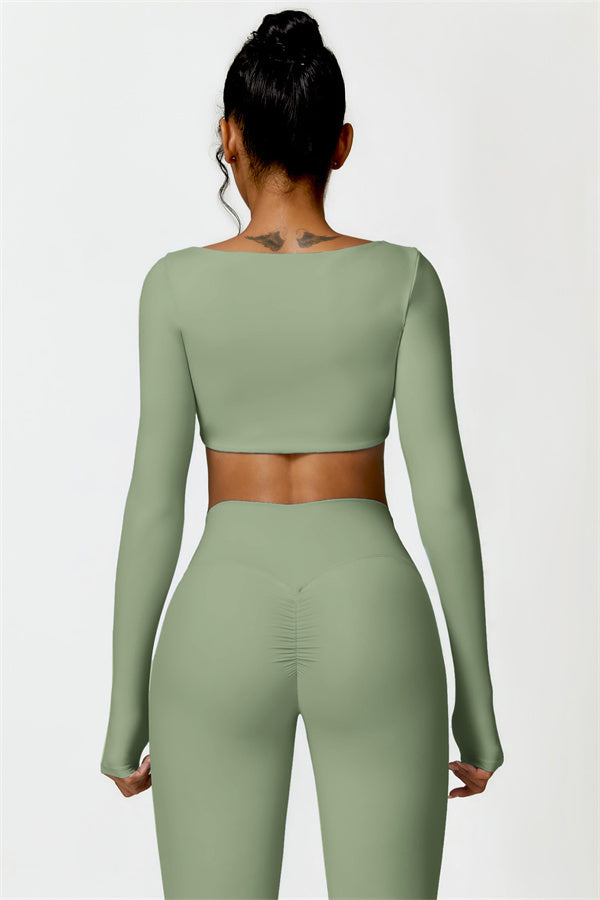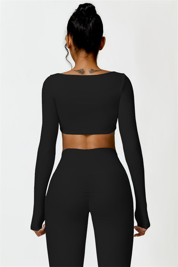 This matching set features a long-sleeve, cropped top designed to accentuate your waistline while providing a sleek and flattering fit. The top’s seamless construction ensures smooth, unrestricted movement for any activity, allowing you to stay comfortable and stylish throughout your workout.