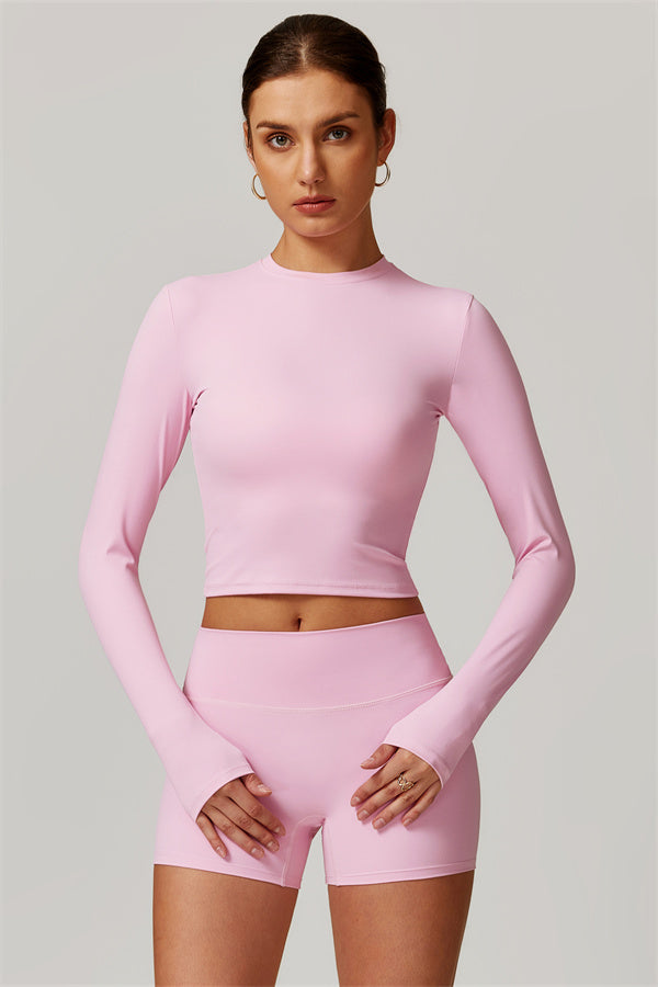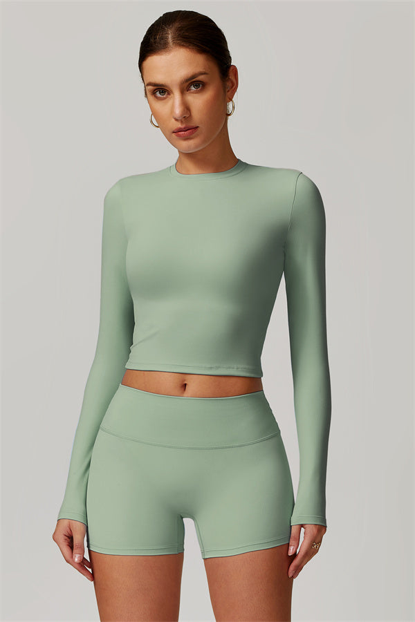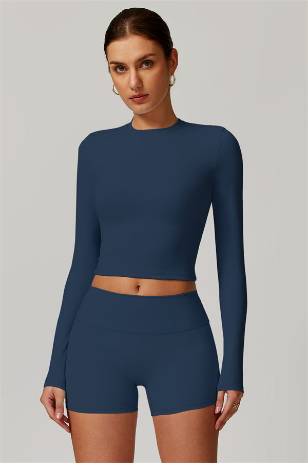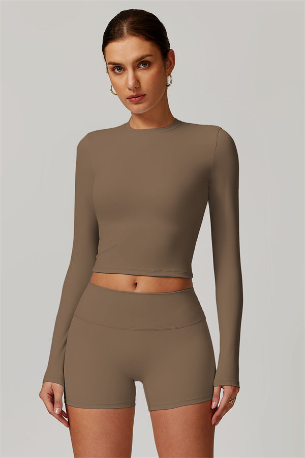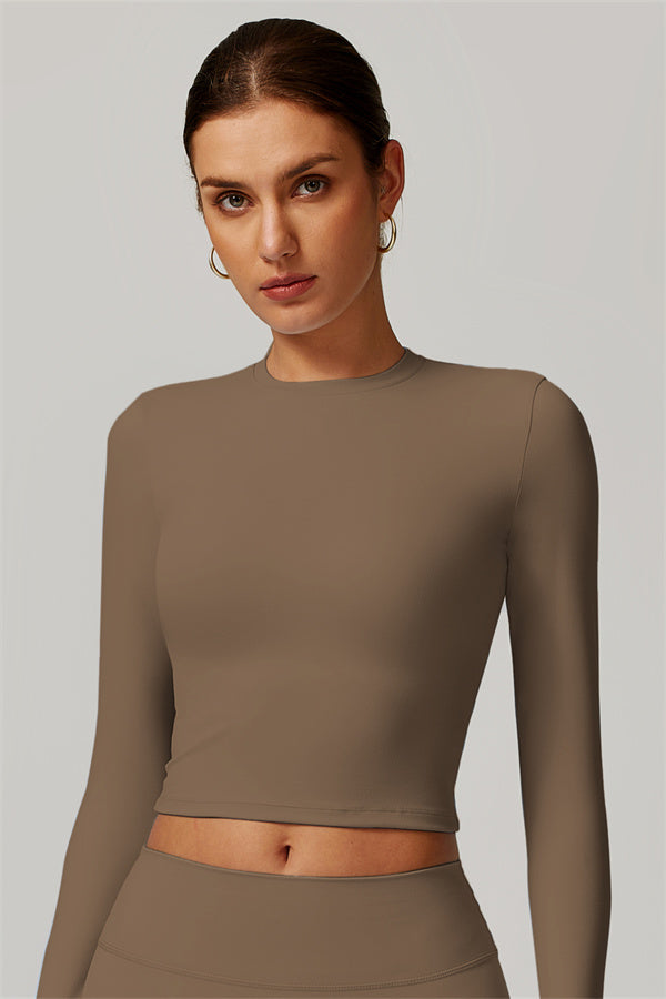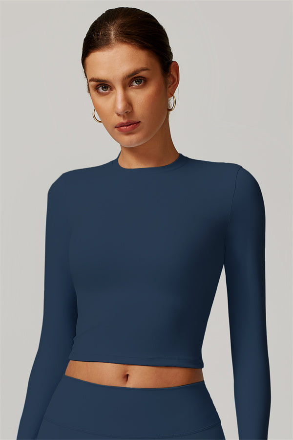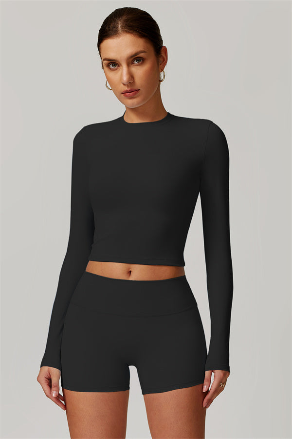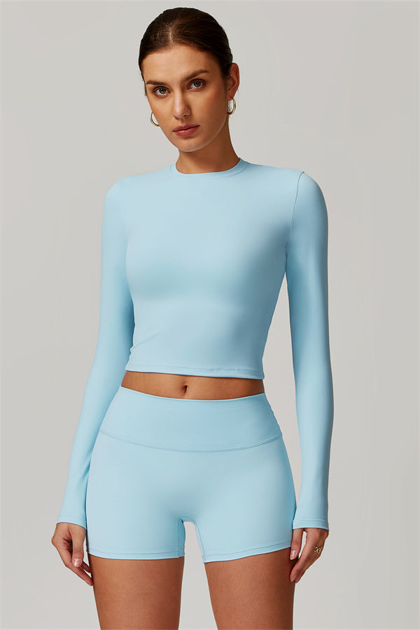 Featuring an extended hem that provides a comfortable and flattering fit. The gentle compression design subtly smooths your midsection while highlighting your waistline for a beautifully shaped silhouette. With a classic round neckline that enhances your neckline, this top combines style and functionality seamlessly.
