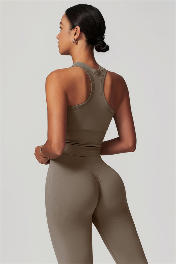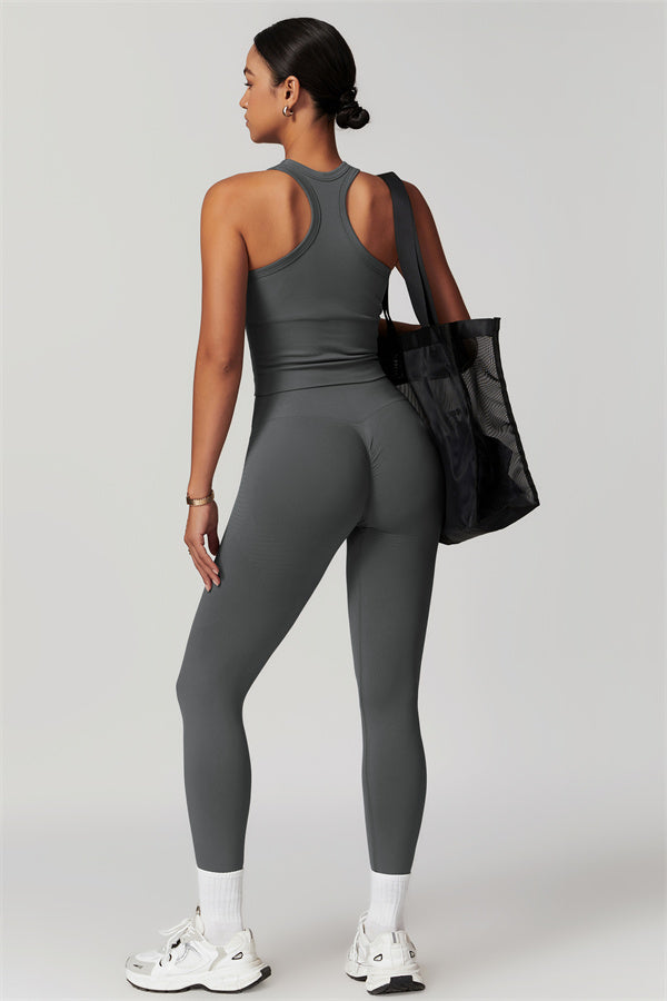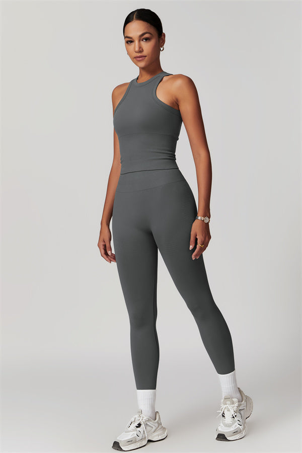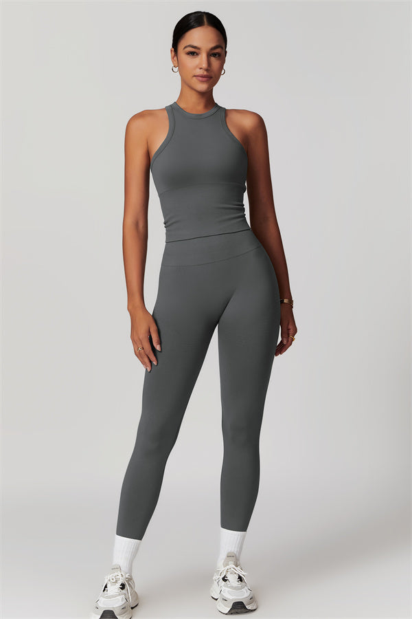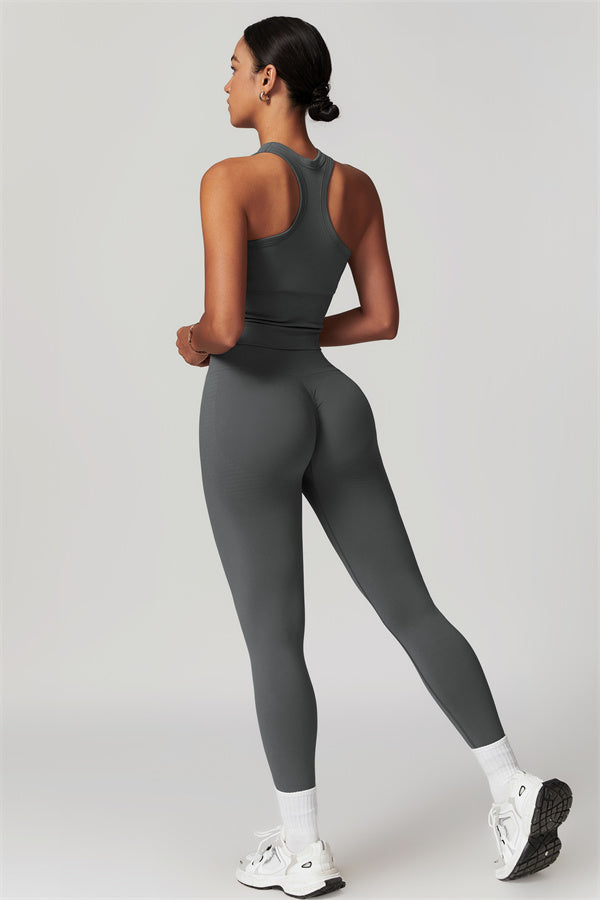 Enhance your style and performance with this matching set, featuring a crop top and leggings designed for both elegance and function. The crop top highlights a racerback design that beautifully accentuates your back and enhances your silhouette, offering a sleek and sporty aesthetic. Paired with high-waisted leggings, the vertical ribbed waistband ensures a snug, figure-flattering fit that sculpts your waist and provides ultimate support during any activity.