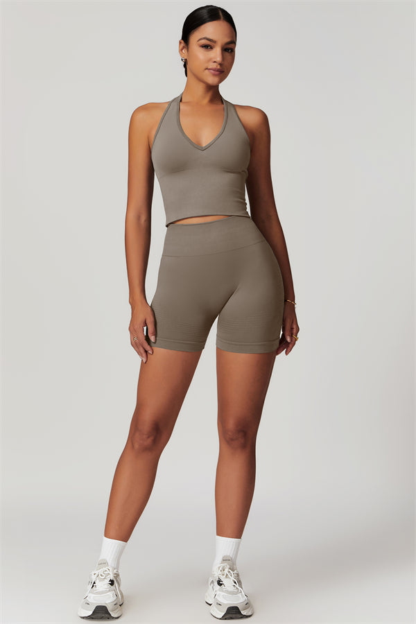 Show off your curves with this elegant and functional matching set, featuring a halter top and shorts crafted for both style and performance. The halter top boasts a deep V-neckline that highlights your collarbones for a touch of sophistication, while the ribbed design adds texture and visual appeal. The high-waisted shorts are designed with a vertical ribbed waistband, providing a secure fit that sculpts your waistline and offers a flattering, streamlined look.