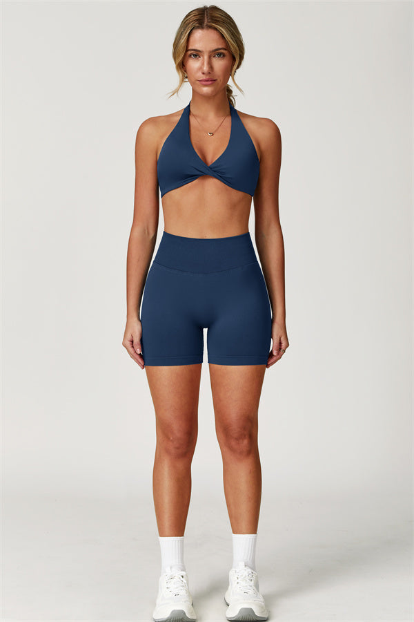 A perfect blend of style, comfort, and performance, the Elara Set features a chic sports bra with a flattering twist design and high-rise shorts that provide full freedom of movement. Ideal for workouts or casual outings, this set has it all.