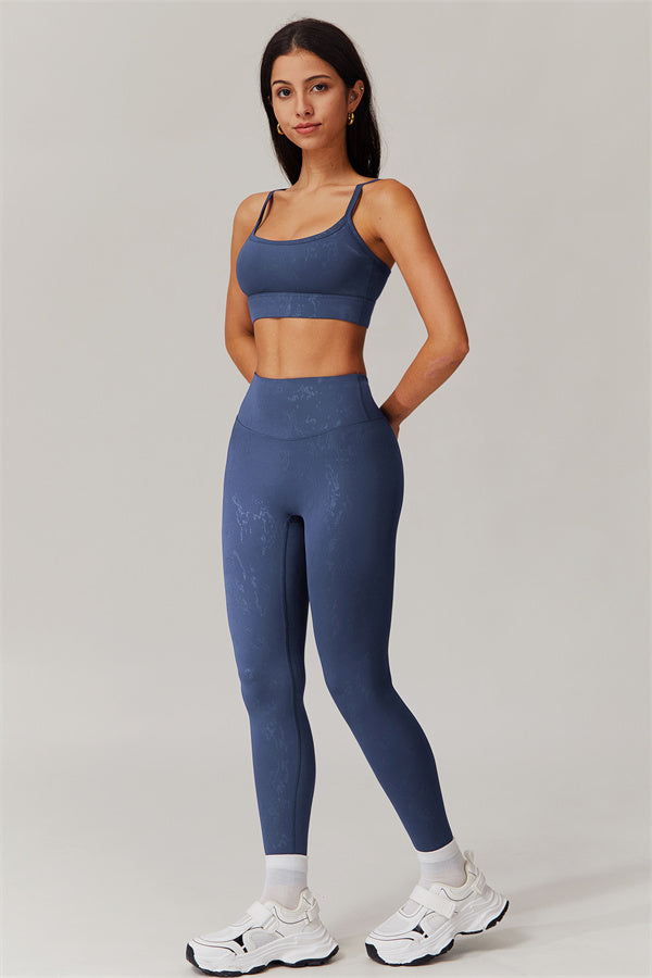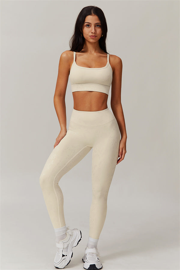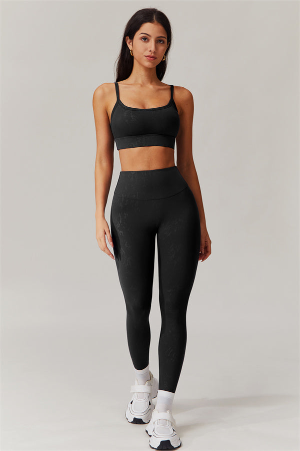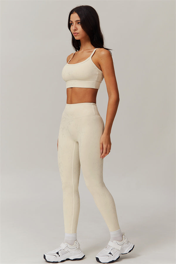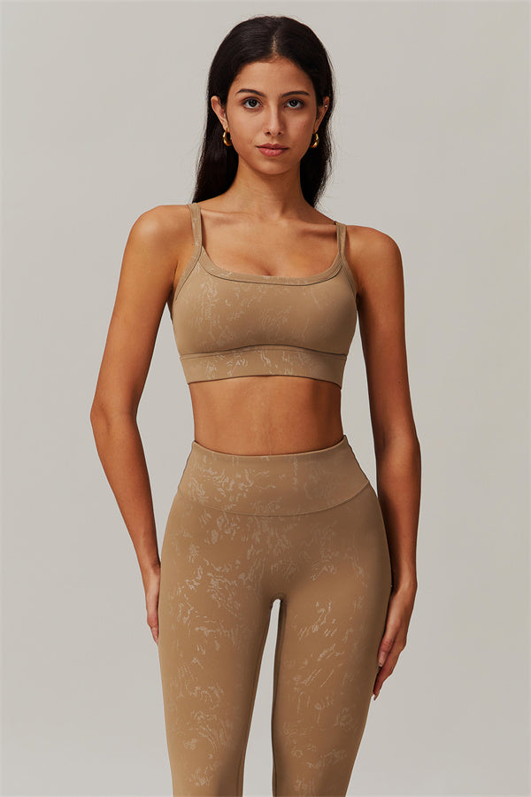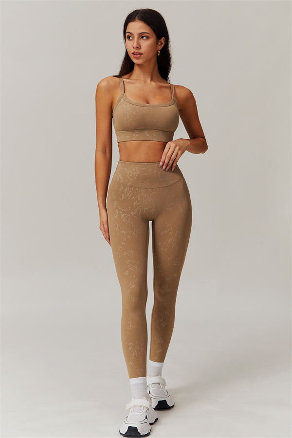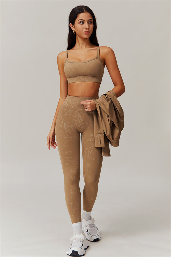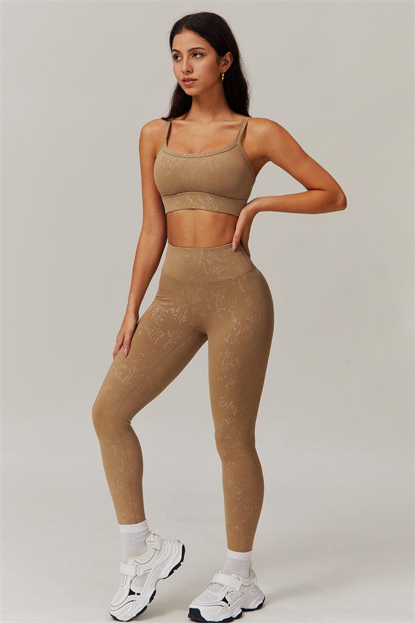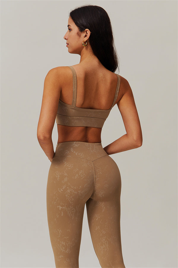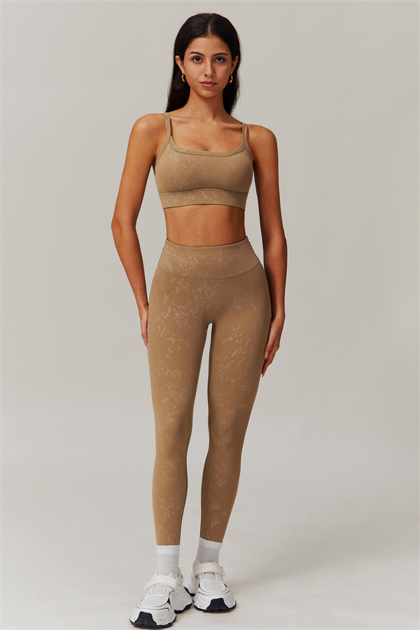 This set blends performance and style with its sleek design, perfect for both workouts and everyday wear. Stay comfortable, supported, and confident in this gold-embossed sports bra and leggings set.