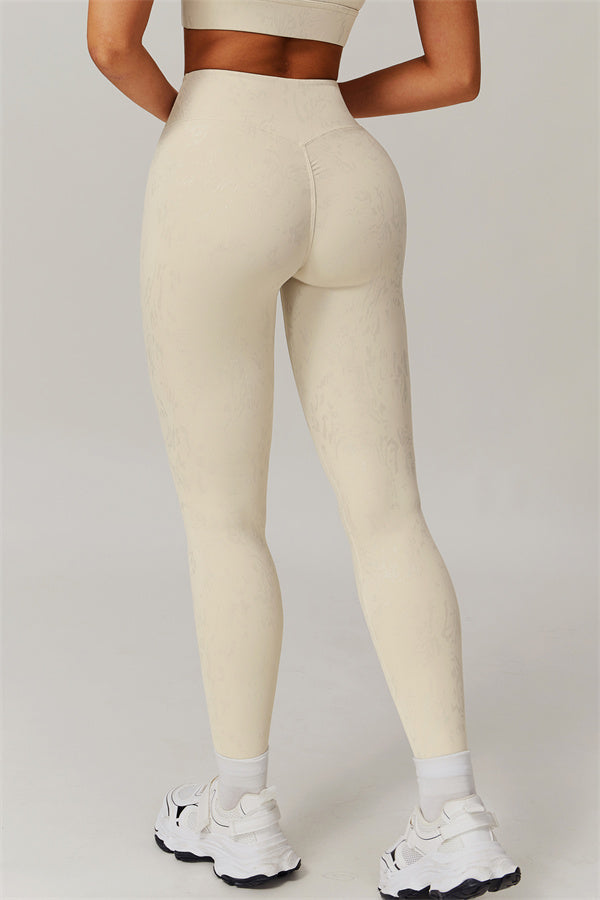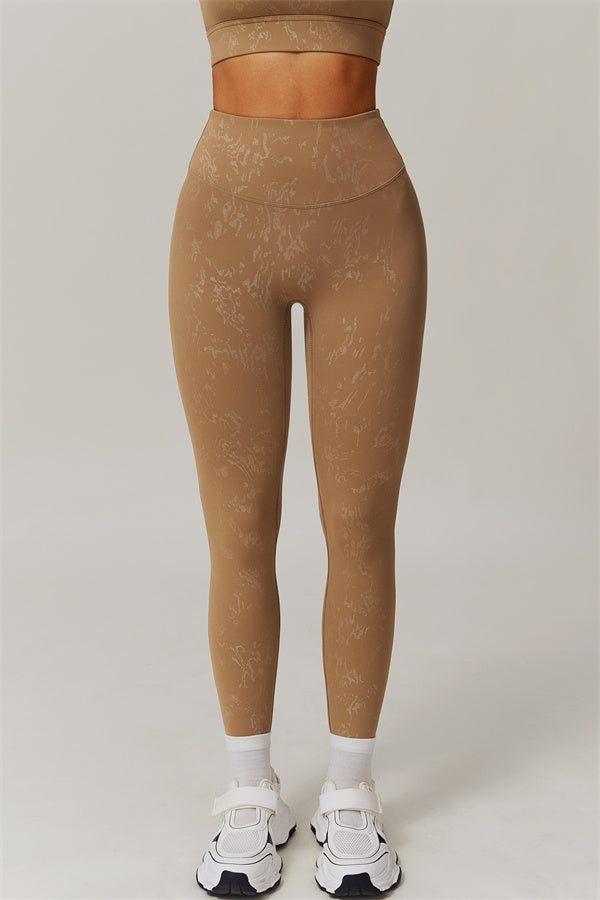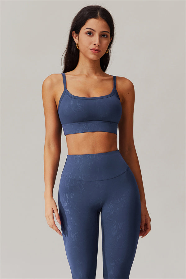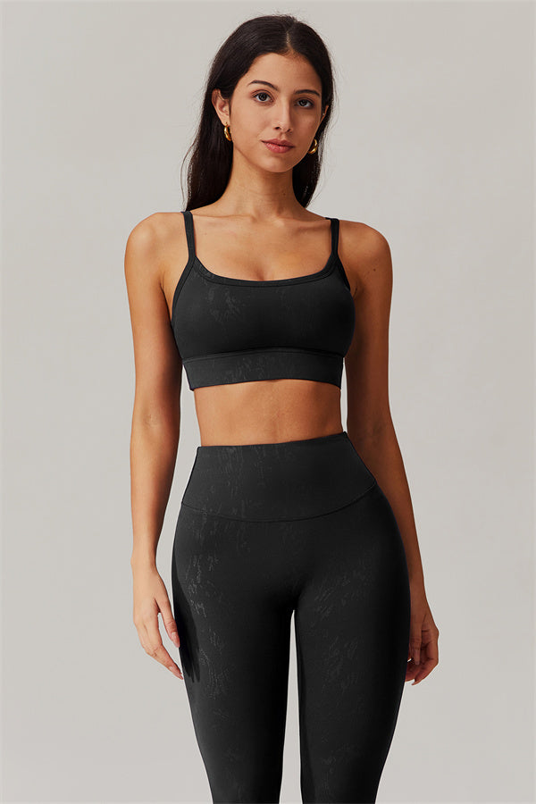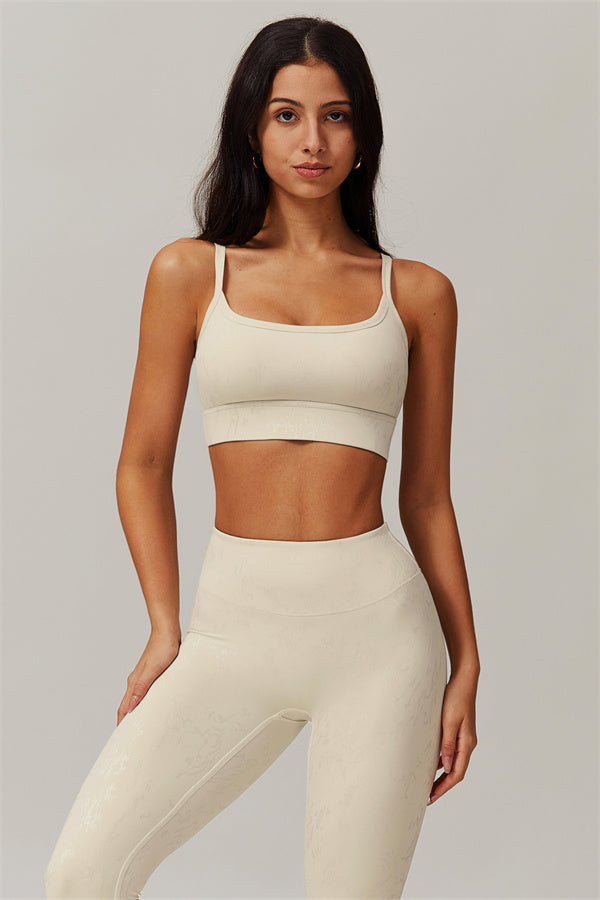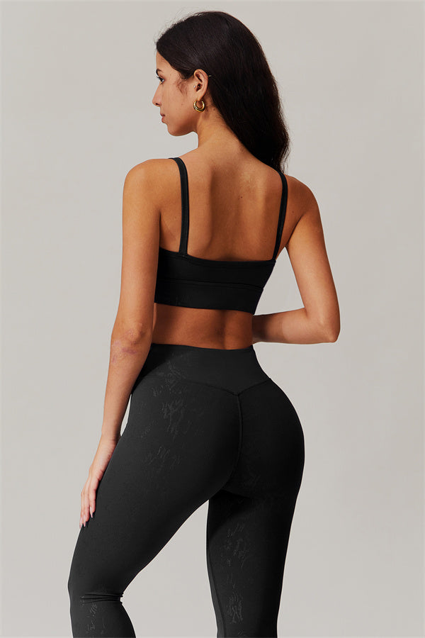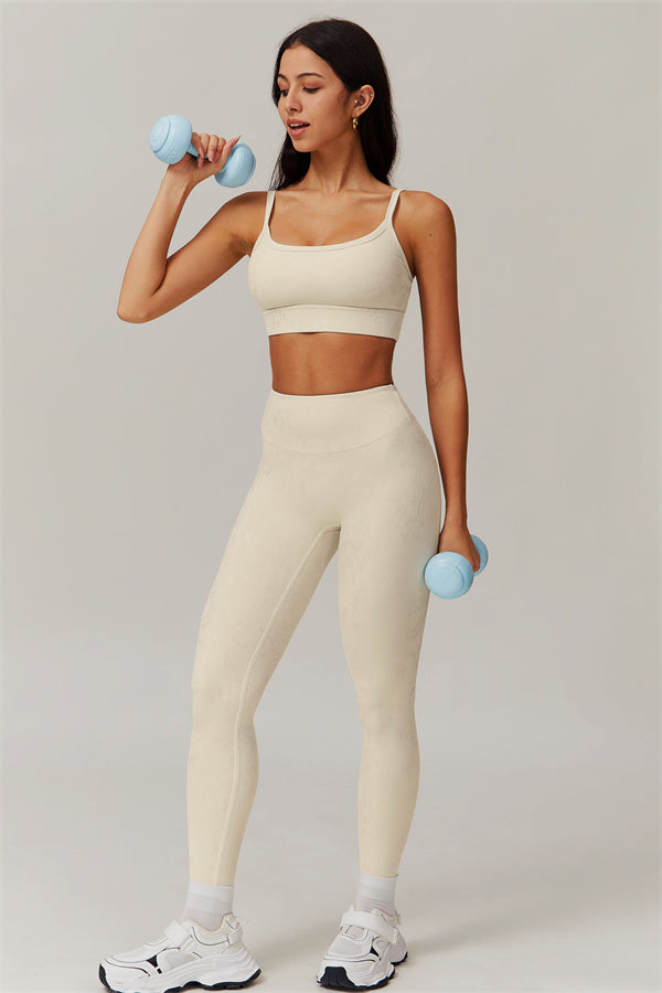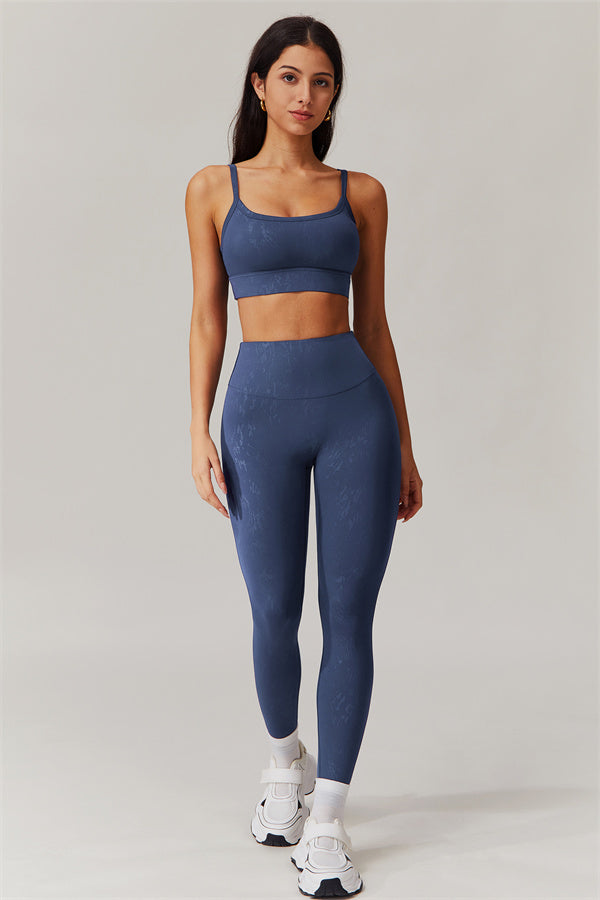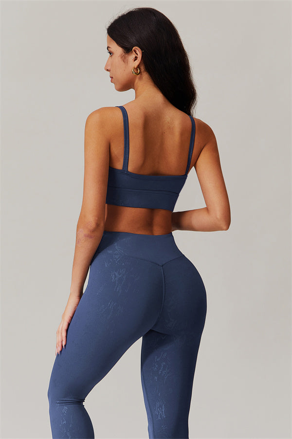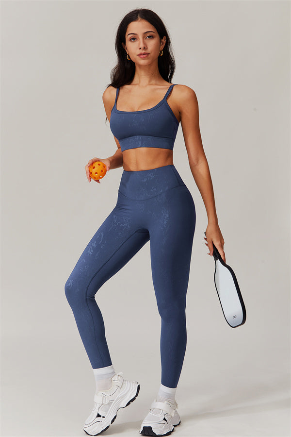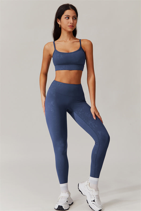 This set blends performance and style with its sleek design, perfect for both workouts and everyday wear. Stay comfortable, supported, and confident in this gold-embossed sports bra and leggings set.