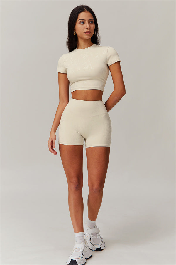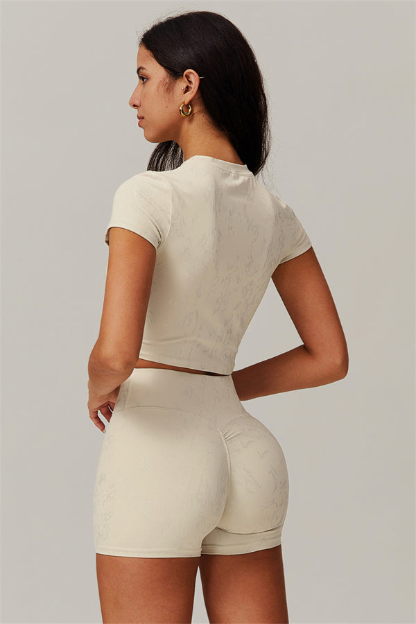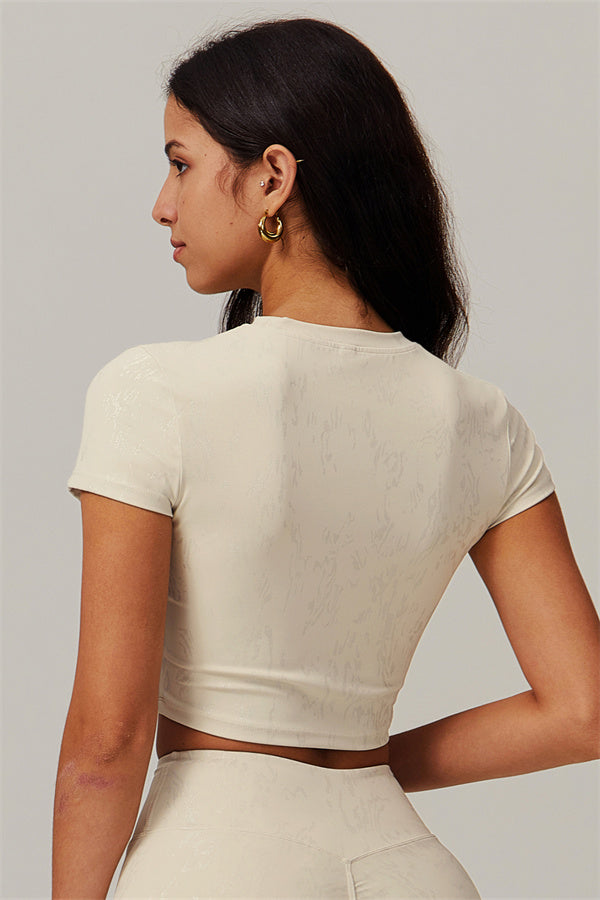 This Gold-Accent Slim Fit T-Shirt combines style with performance, featuring a sophisticated metallic print created using advanced rolling printing techniques. The shimmering gold accents elevate the look, making this tee a versatile piece that transitions seamlessly from the gym to casual outings. Its slim-fit design hugs the body, providing a contoured silhouette that enhances your natural curves while still allowing freedom of movement.