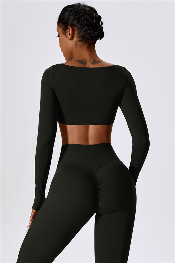 This stylish matching set, featuring a long sleeve top and leggings, is designed to enhance both comfort and performance. The top features a flattering wide neckline that perfectly fits your shoulders, while its mid-length cut subtly highlights your waistline. The sculpted design of the leggings with a gathered waistband accentuates your curves and lifts your booty for a beautifully contoured shape.