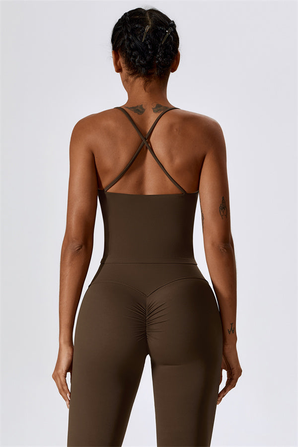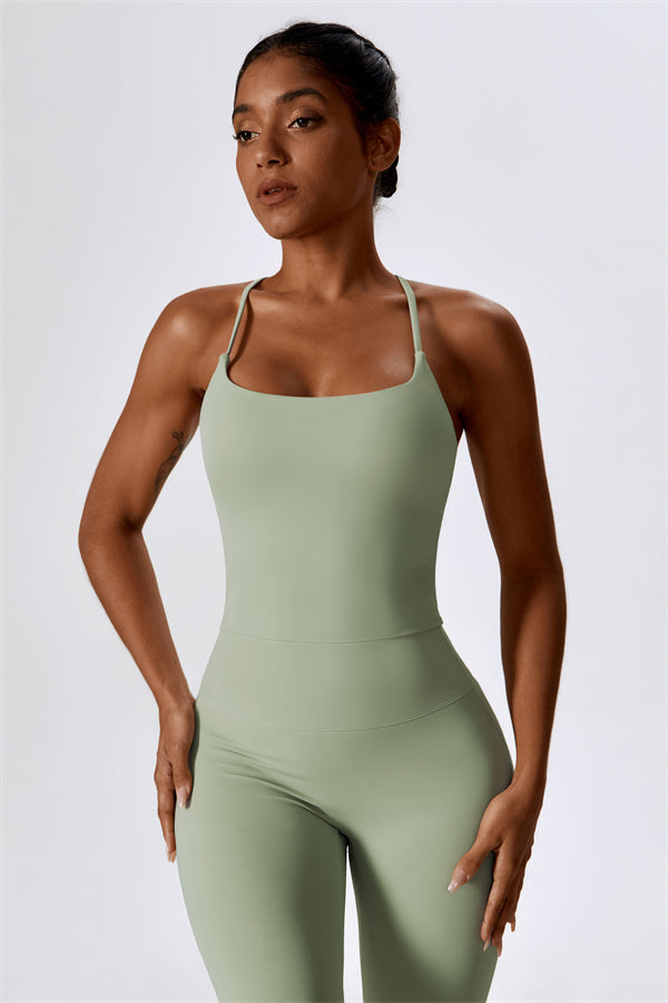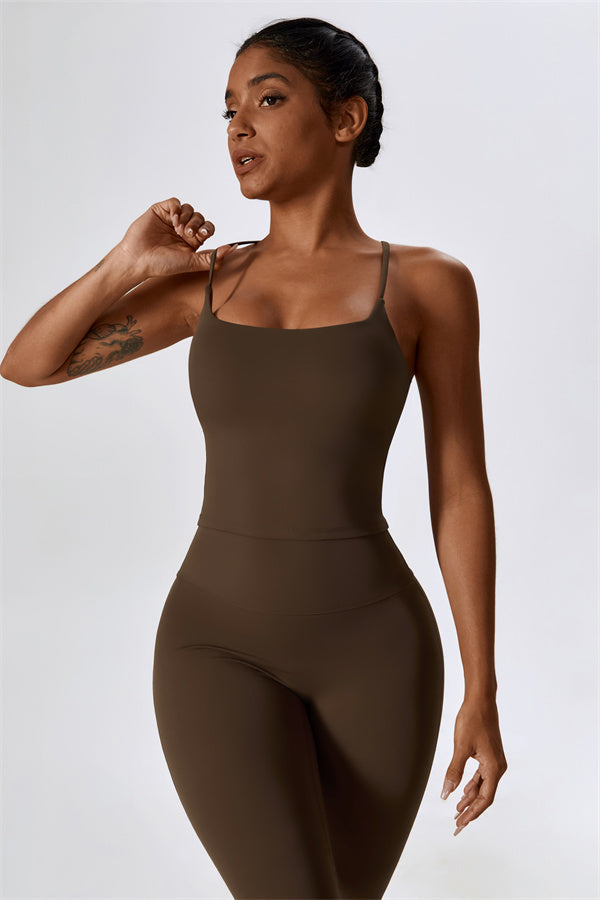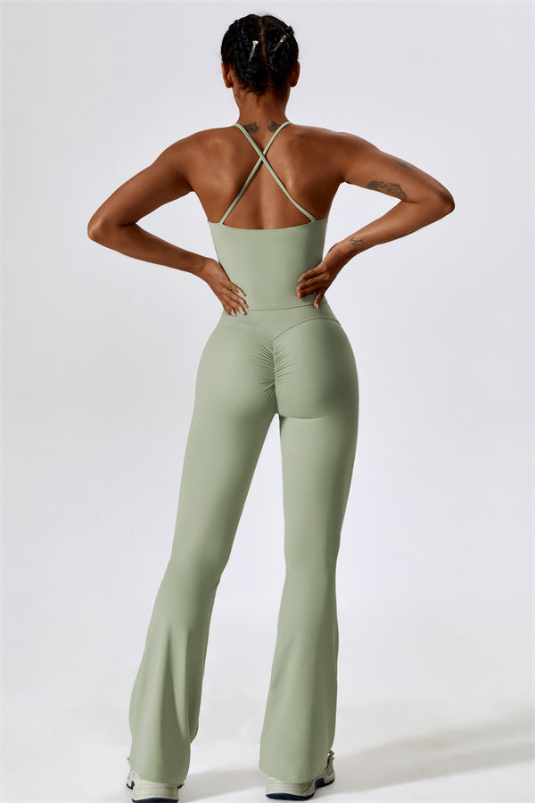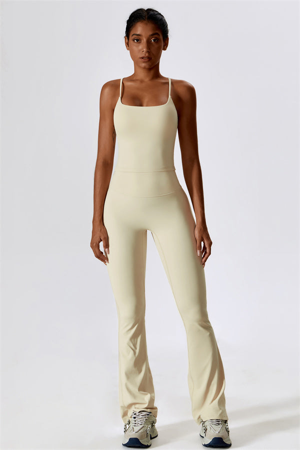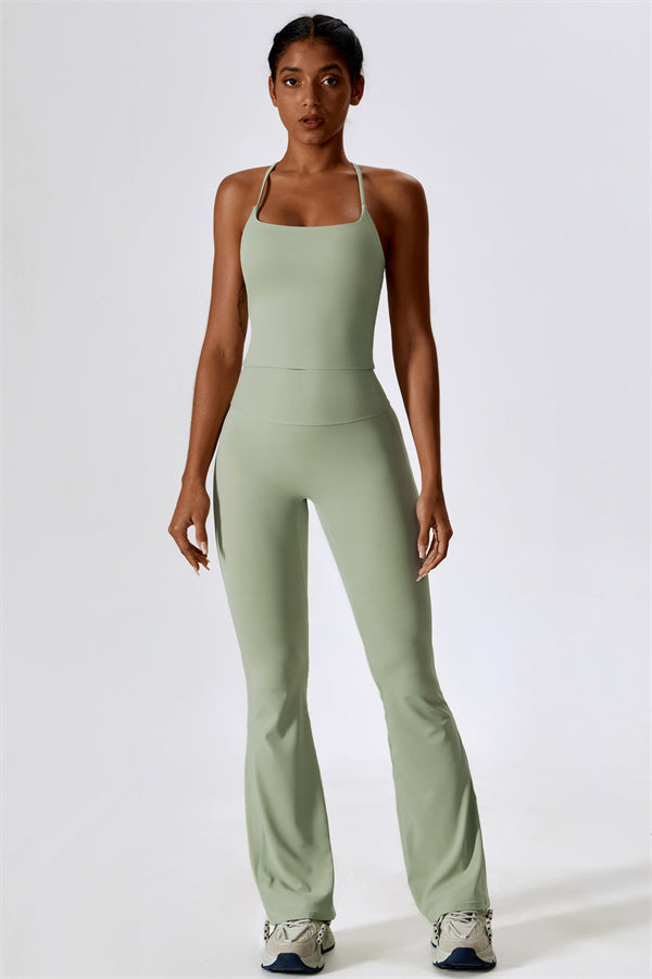 This matching set, which includes a crop top and leggings, combines comfort, style, and performance for the perfect workout ensemble. The crop top features an extended hem for a comfortable, gentle tummy control effect, and the crisscross straps beautifully highlight your back. The leggings are designed with a flattering bell-bottom silhouette, enhancing the shape of your legs while the sculpted rear design emphasizes your natural curves, creating a smooth, peachy silhouette.