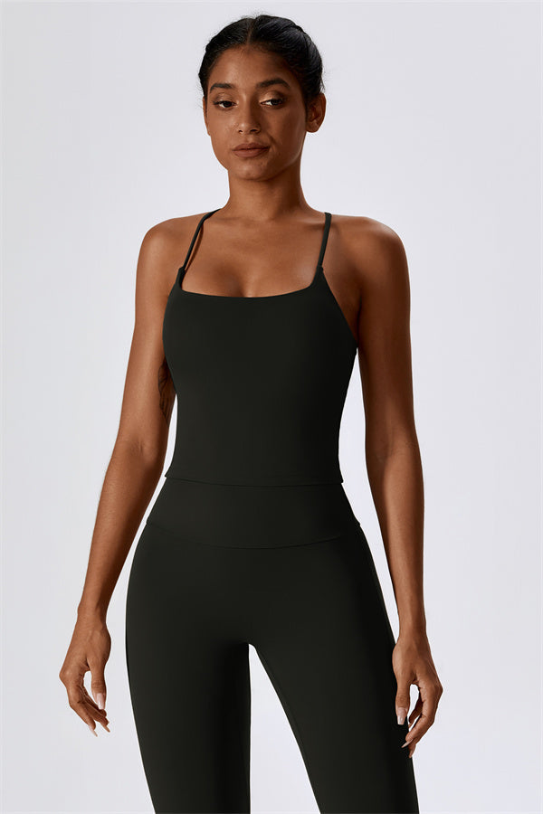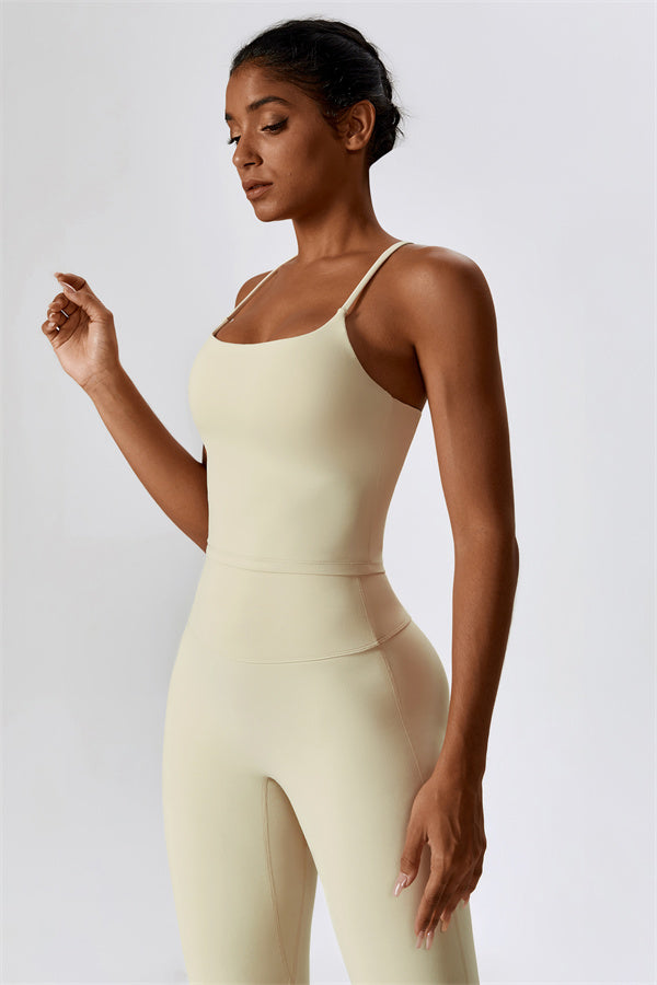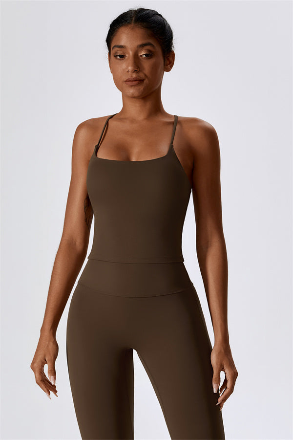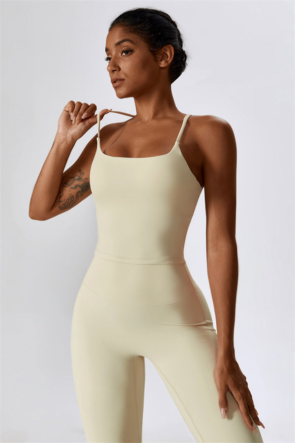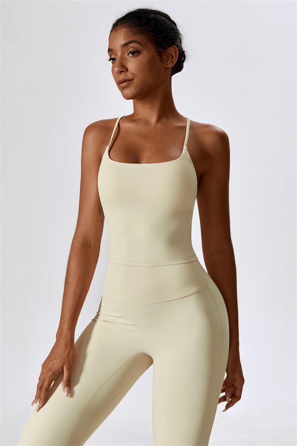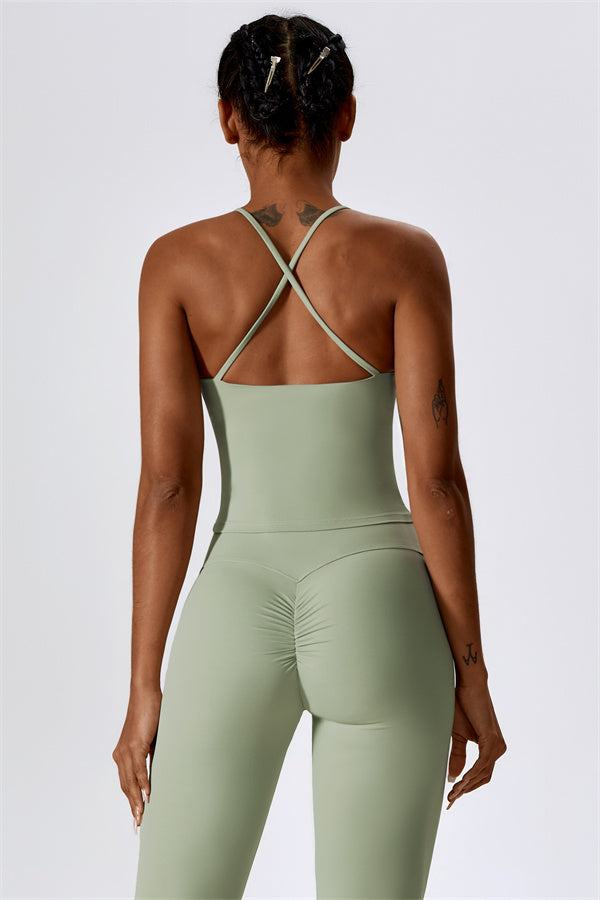 This matching set, which includes a crop top and leggings, combines comfort, style, and performance for the perfect workout ensemble. The crop top features an extended hem for a comfortable, gentle tummy control effect, and the crisscross straps beautifully highlight your back. The leggings are designed with a flattering bell-bottom silhouette, enhancing the shape of your legs while the sculpted rear design emphasizes your natural curves, creating a smooth, peachy silhouette.