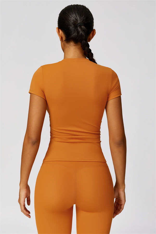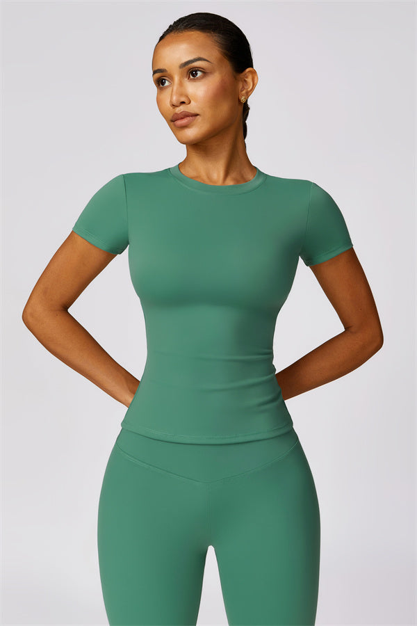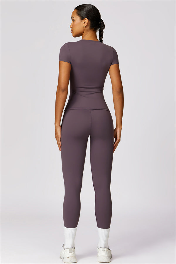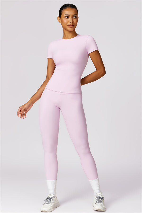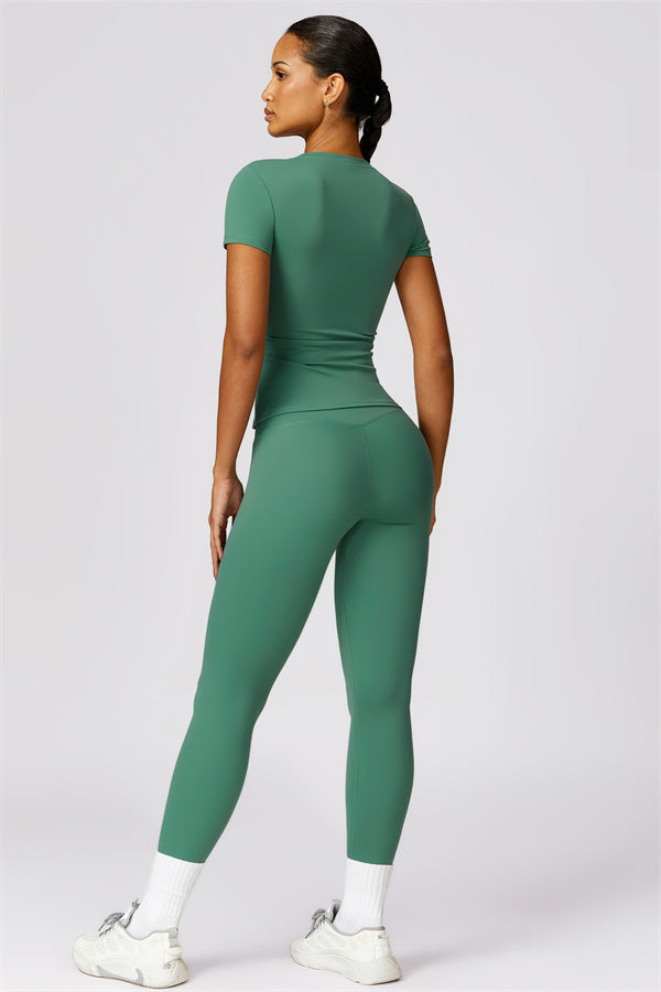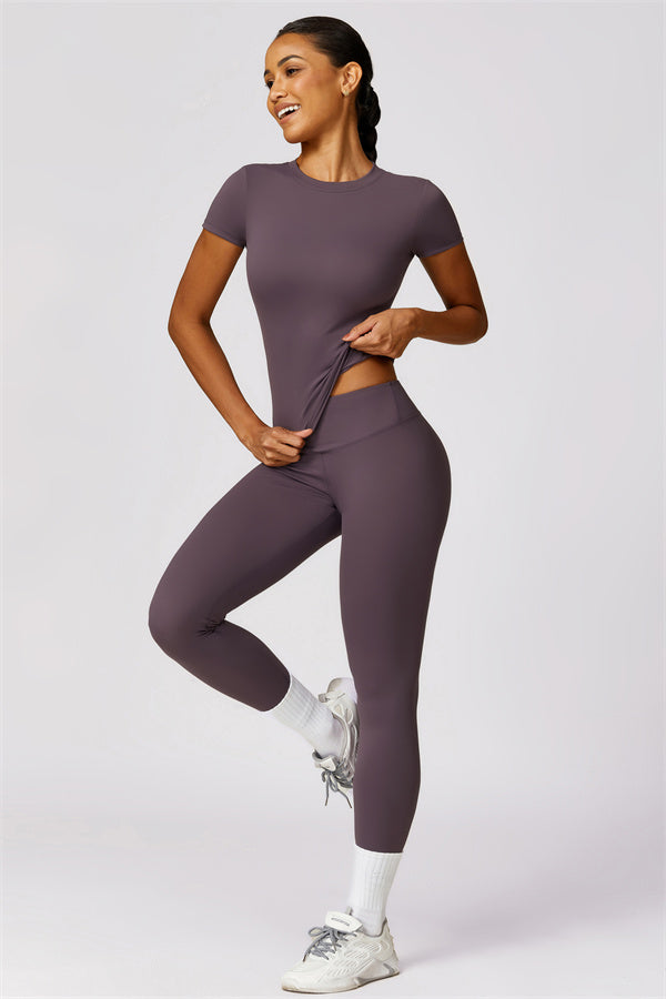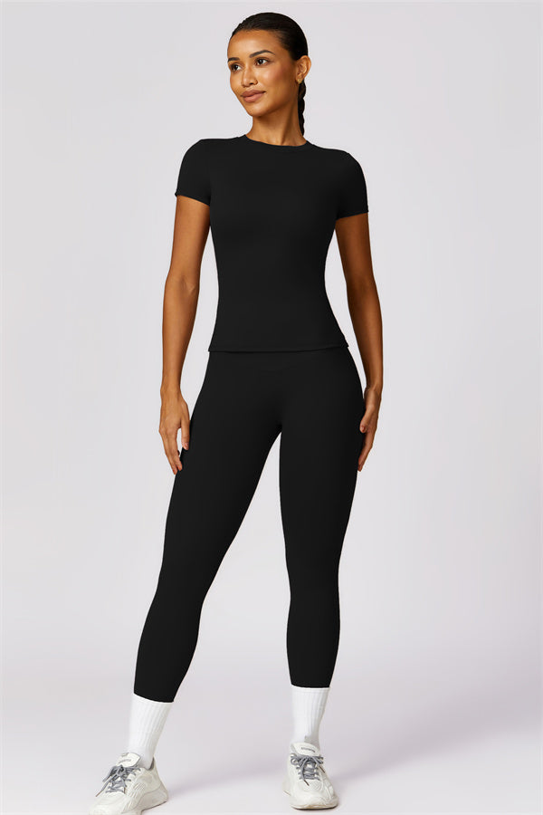 Discover the perfect blend of style and performance with this matching set, featuring a T-shirt and leggings that are ideal for any workout or casual day out. The T-shirt showcases a classic crew neck design that beautifully frames and enhances your neckline, while the leggings offer a flattering and sculpting fit, designed to accentuate your curves and create a round, lifted look.