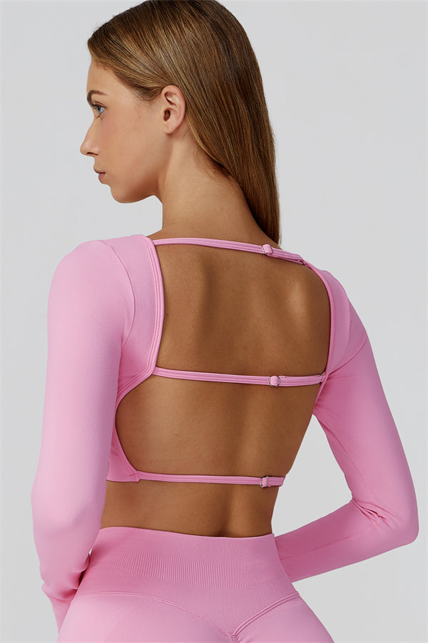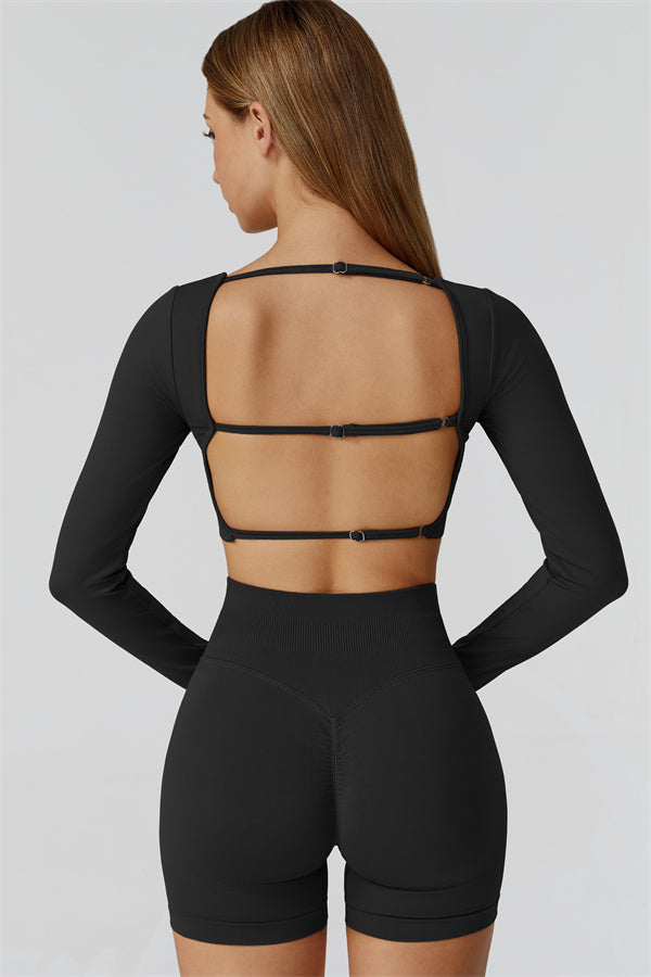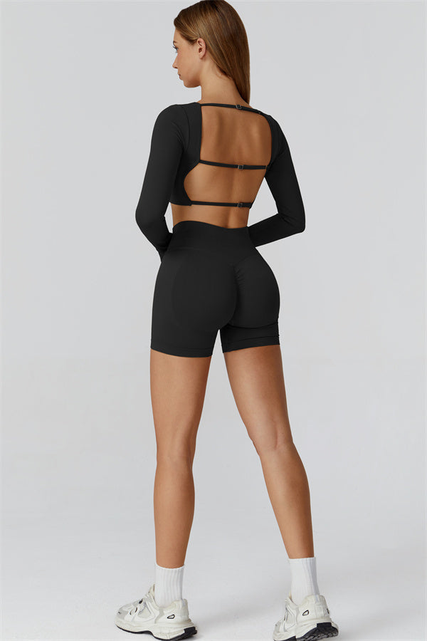 Stay cool and confident with the Reign Set, featuring a breathable, open-back long sleeve crop top and sculpting high-waisted shorts. Made from seamless, recycled knit fabric, this matching set sculpts your silhouette while offering comfort and versatile style from workout to streetwear.