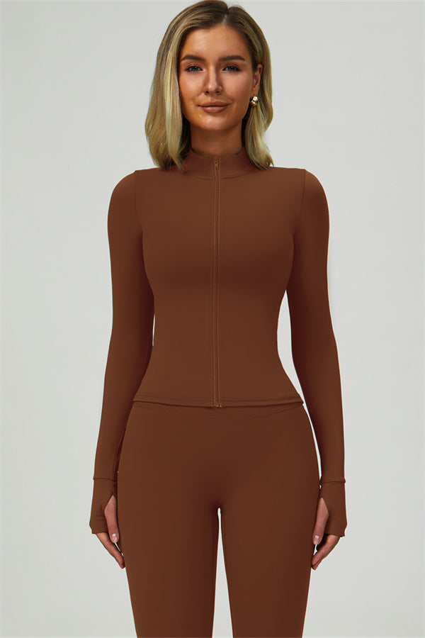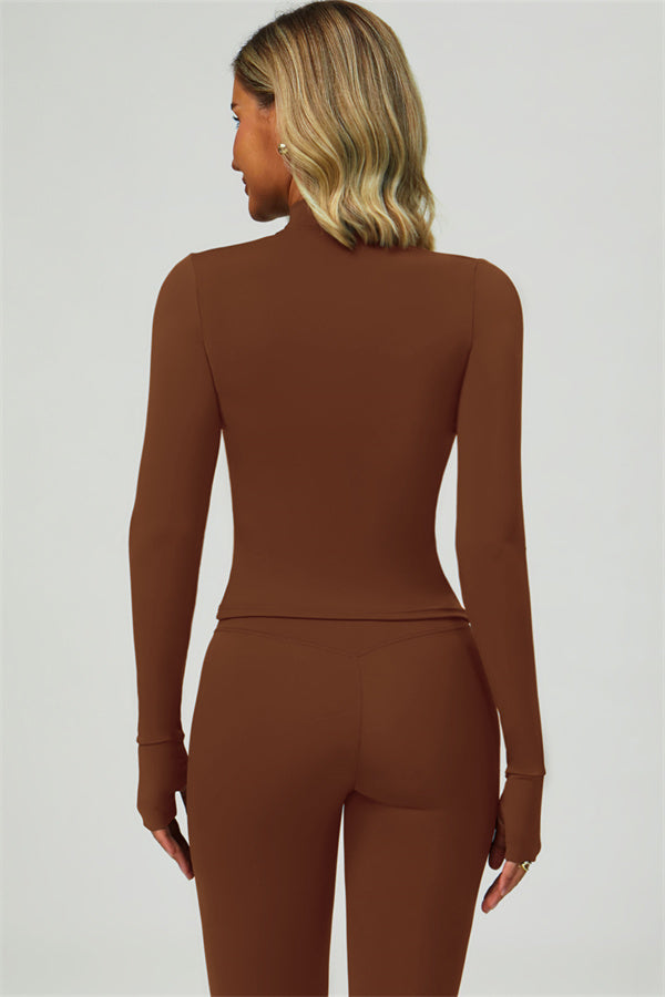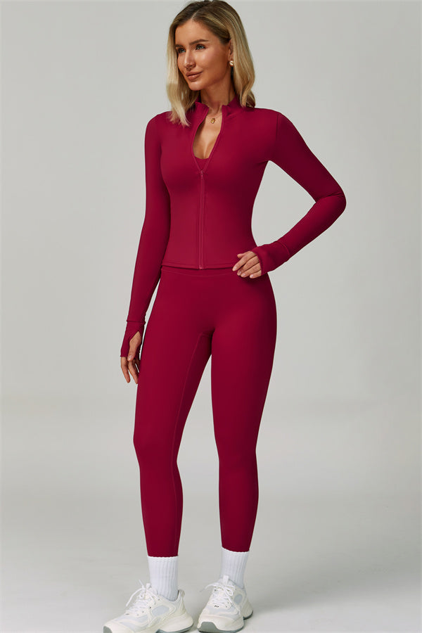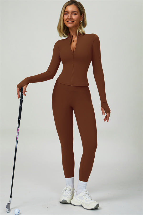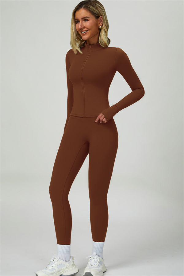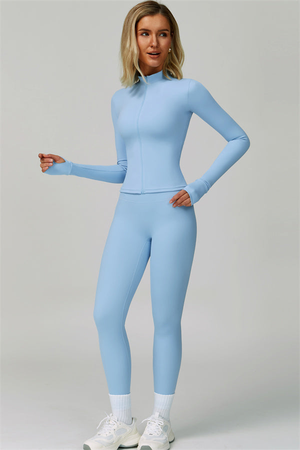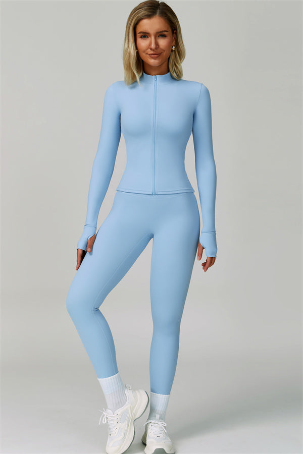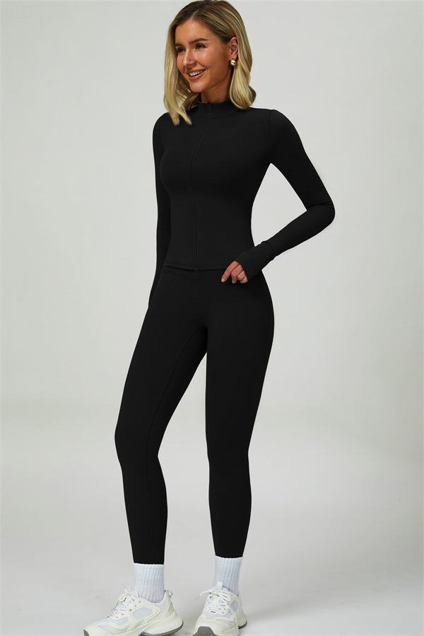 This matching set features a long-sleeve top with extended cuffs and thumbholes, adding a touch of functional style while keeping your hands secure and warm during workouts. The top provides a sleek, fitted design that offers full range of motion, ensuring you can move with ease.