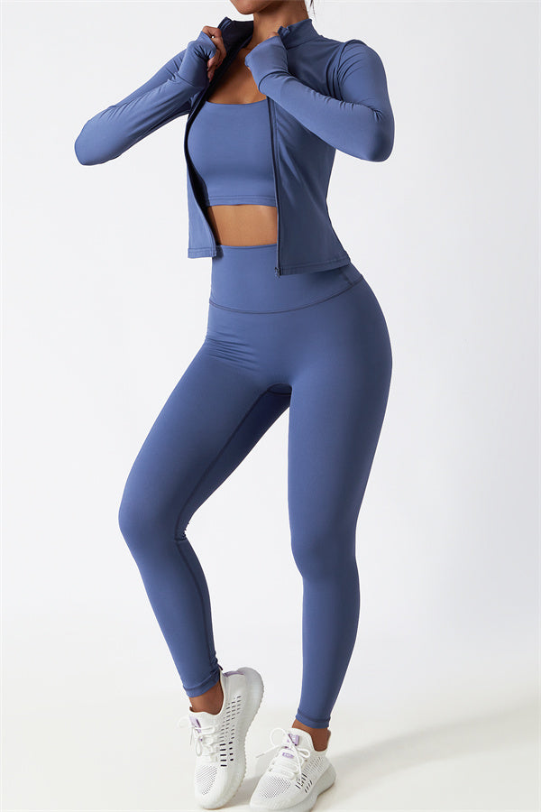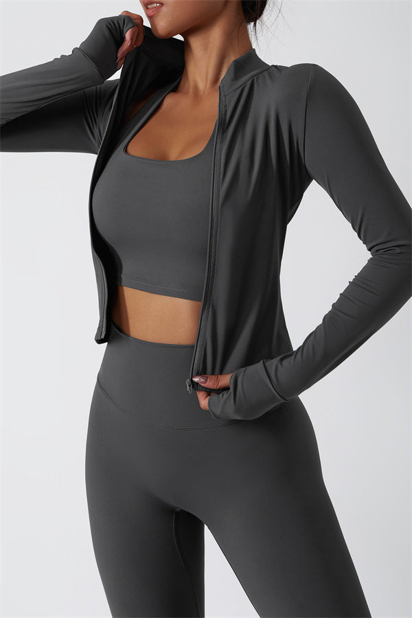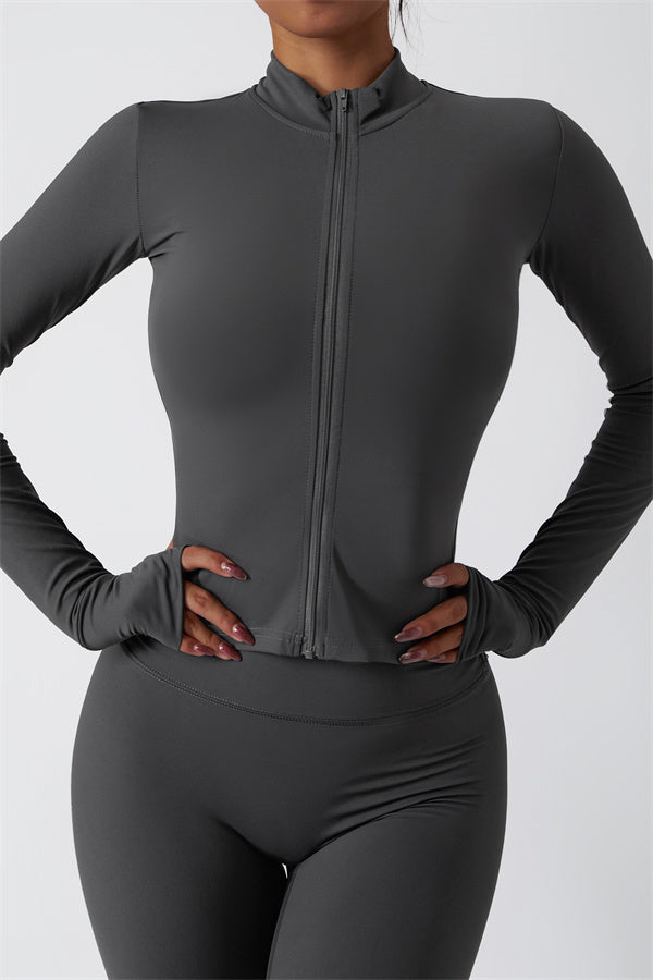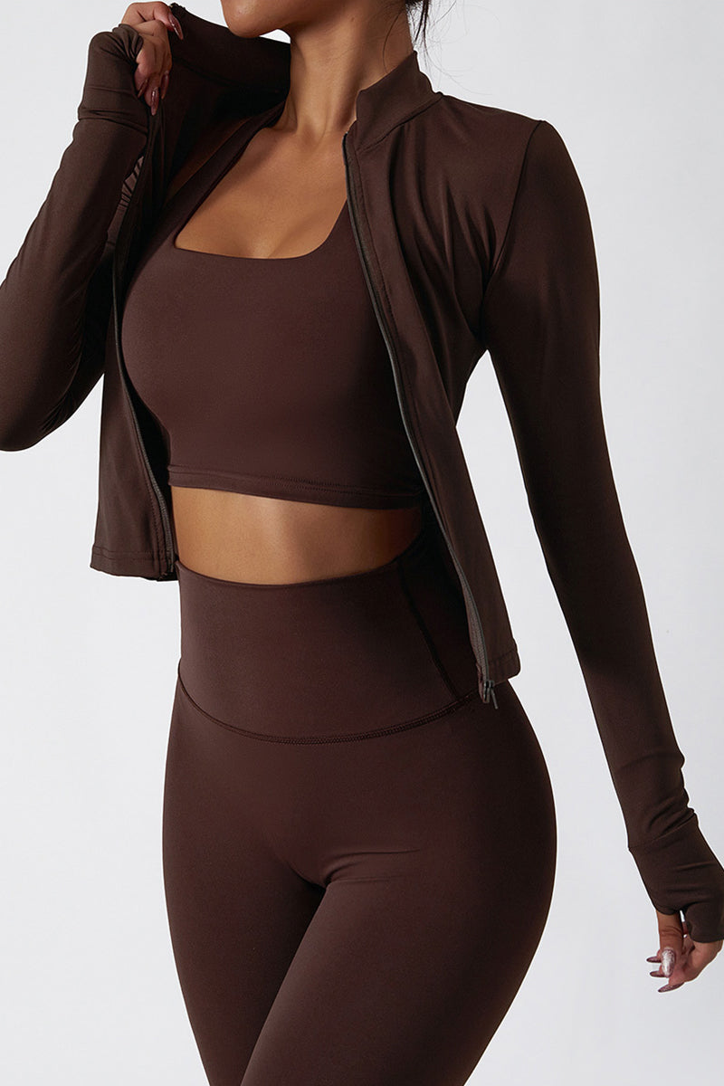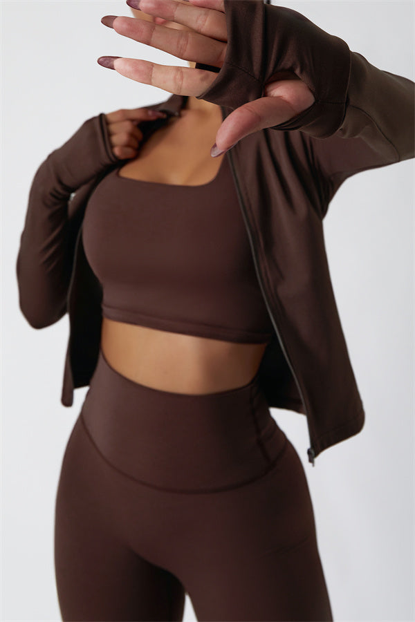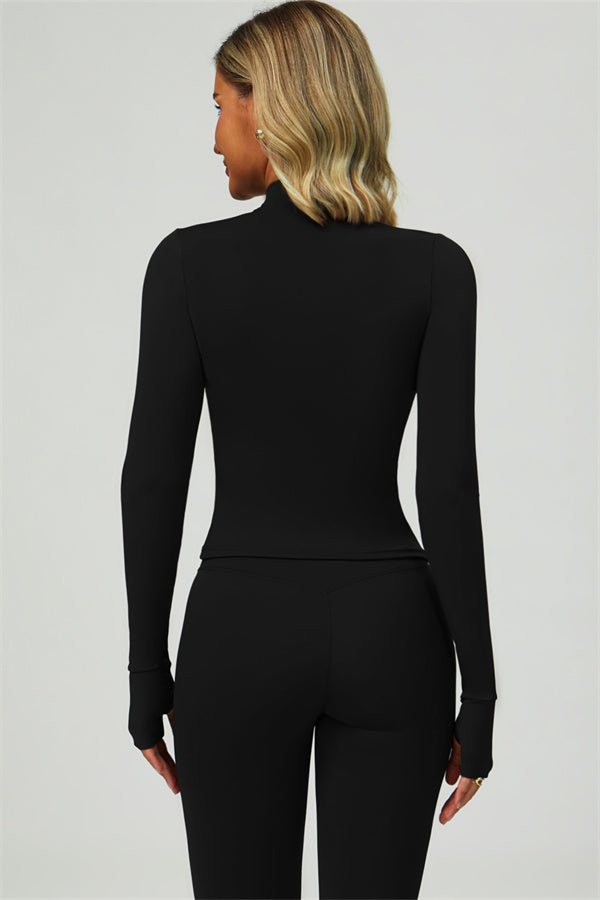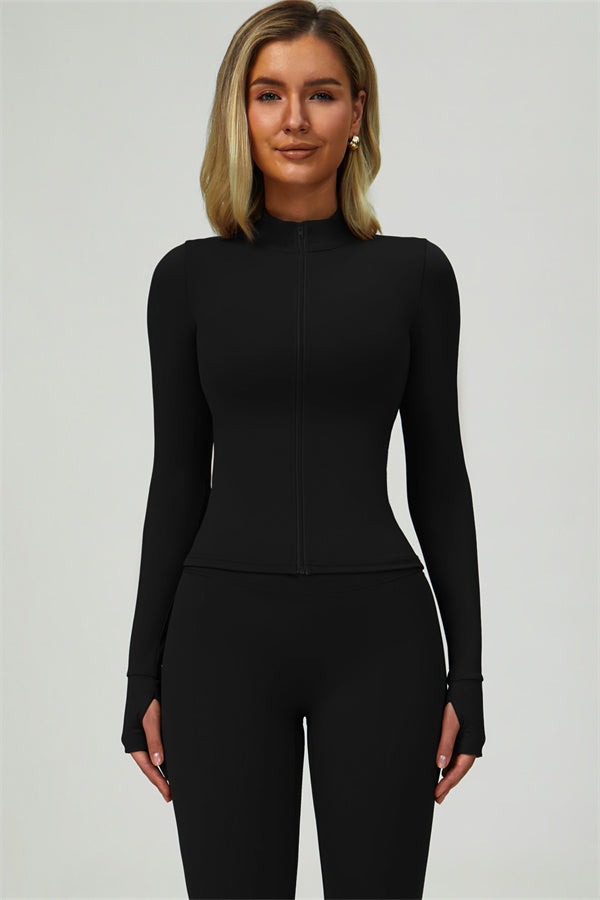 This matching set features a long-sleeve top with extended cuffs and thumbholes, adding a touch of functional style while keeping your hands secure and warm during workouts. The top provides a sleek, fitted design that offers full range of motion, ensuring you can move with ease.