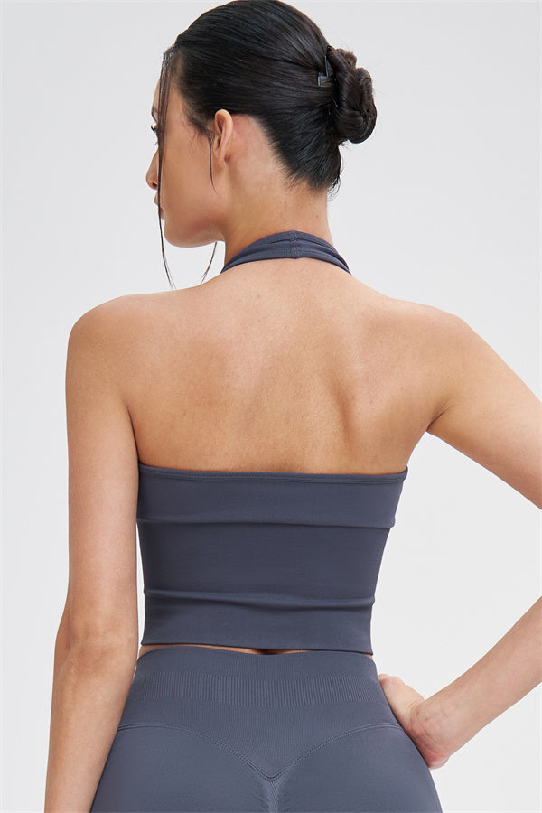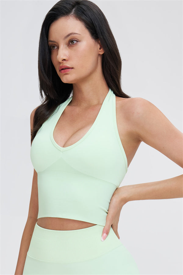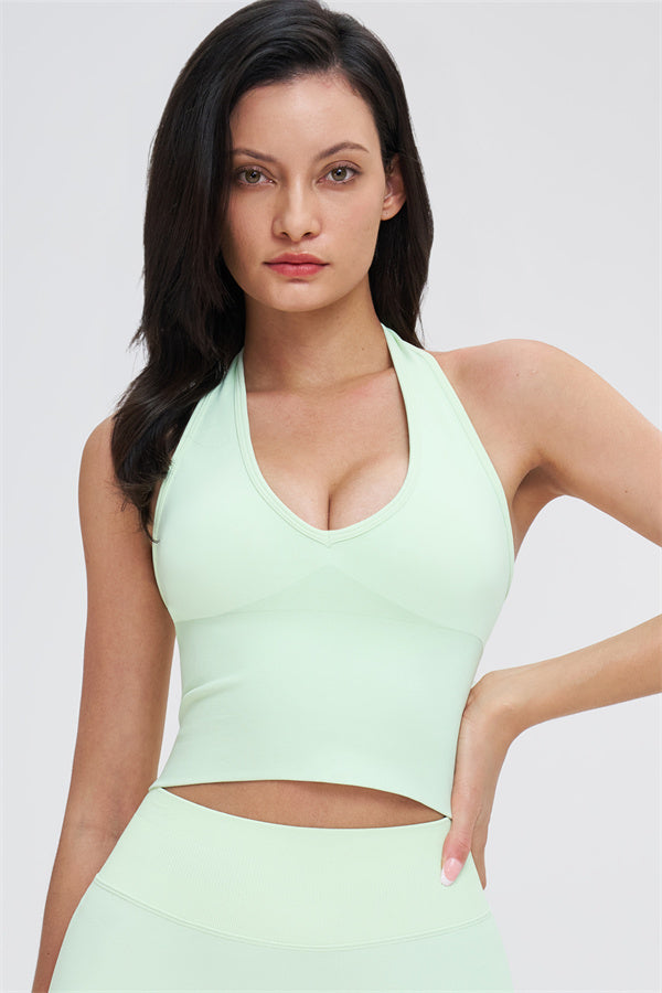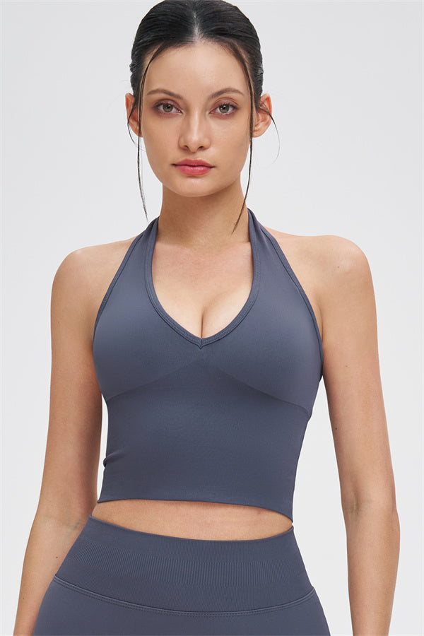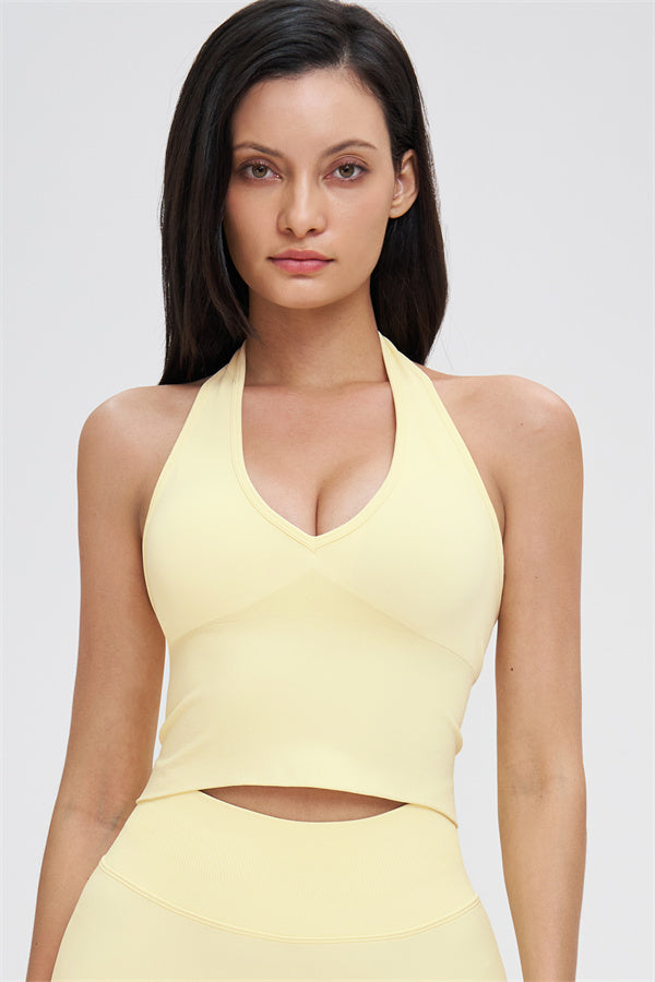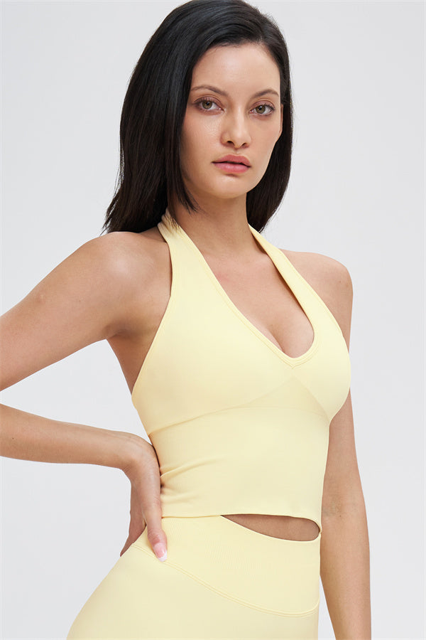 This halter top is designed to enhance your natural curves while providing comfort and support for all your active moments. The low-cut V-neckline beautifully highlights your collarbone, while the cut-out halter strap showcases your elegant shoulder blades for a touch of sensuality. The longer hemline ensures a comfortable, snug fit that flatters your shape and helps smooth out the midsection.