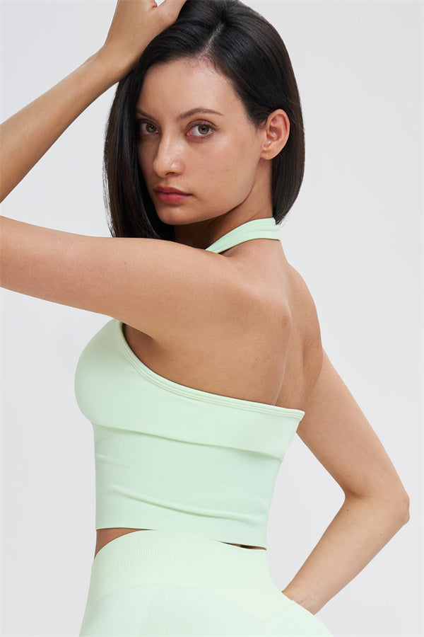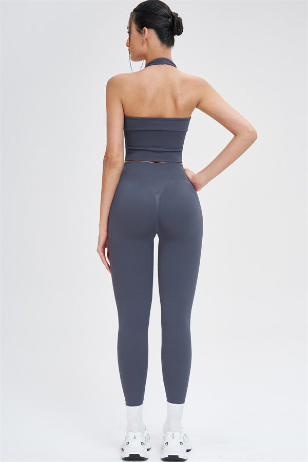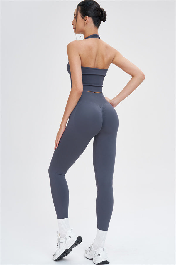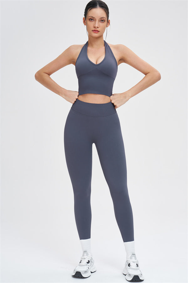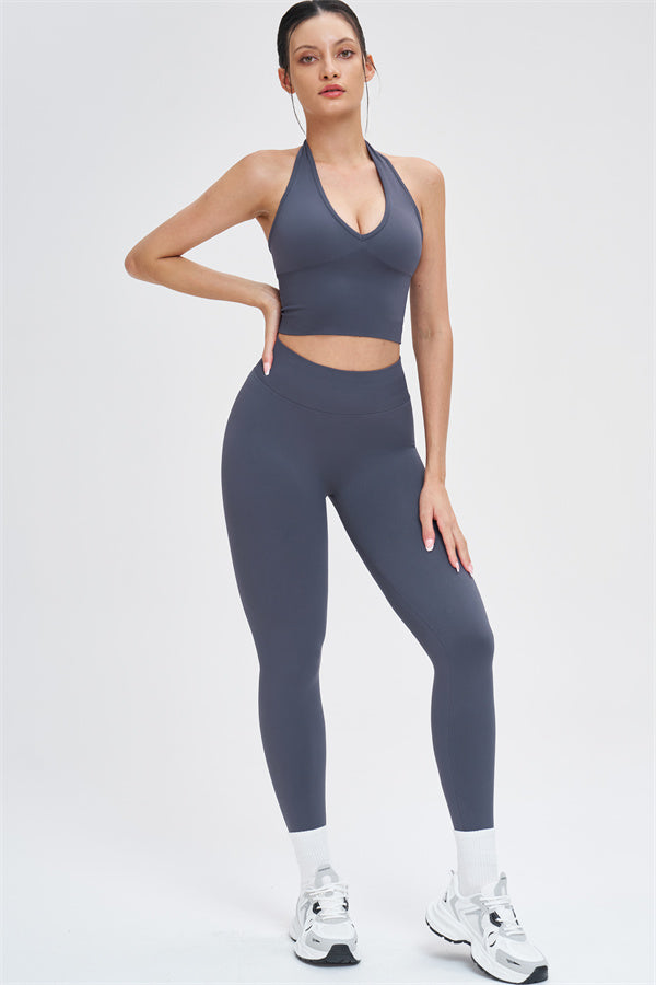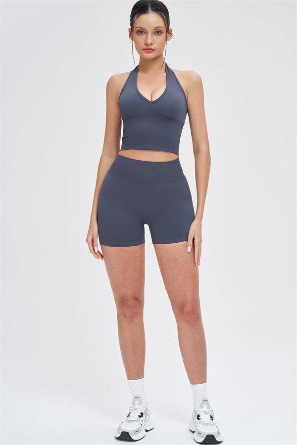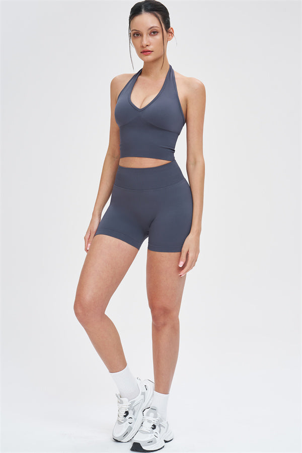 This halter top is designed to enhance your natural curves while providing comfort and support for all your active moments. The low-cut V-neckline beautifully highlights your collarbone, while the cut-out halter strap showcases your elegant shoulder blades for a touch of sensuality. The longer hemline ensures a comfortable, snug fit that flatters your shape and helps smooth out the midsection.