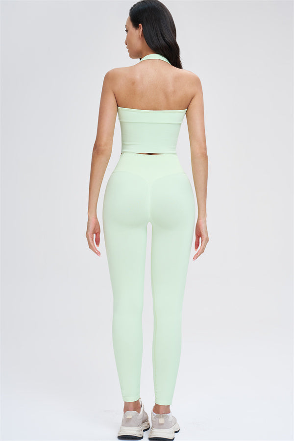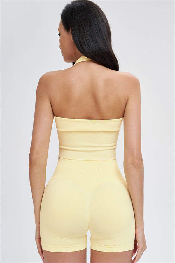 Crafted from seamless knit fabric with a blend of 90% recycled nylon and 10% spandex, this halter top offers a soft, skin-friendly feel with excellent stretch and durability. The waist-cinching design sculpts and flatters your figure, providing a sleek, shapely look without compromising on comfort. Perfect for workouts or casual wear, this versatile halter top delivers style, performance, and a confident fit all in one.