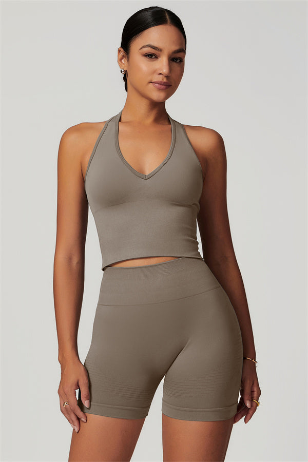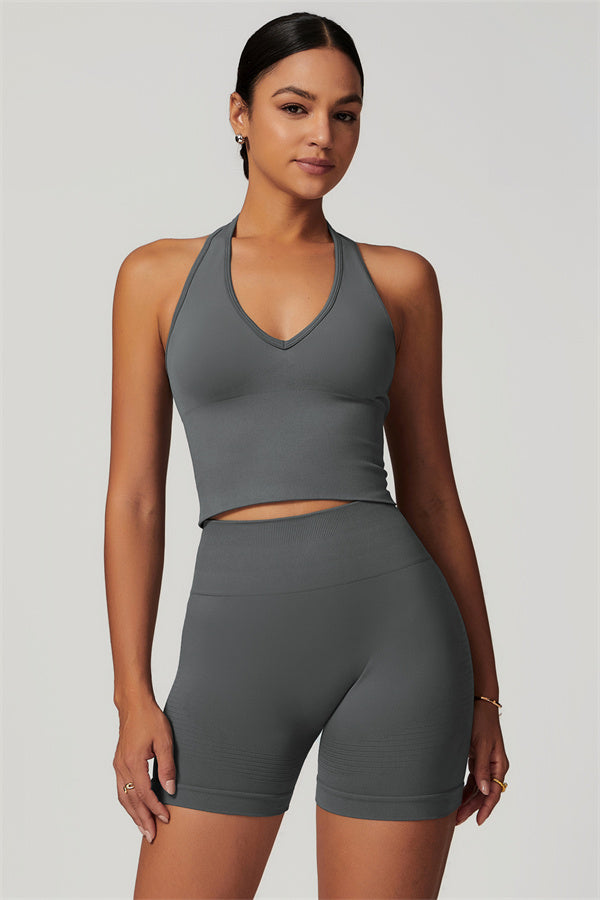 This halter top is designed to enhance your natural curves while providing comfort and support for all your active moments. The low-cut V-neckline beautifully highlights your collarbone, while the cut-out halter strap showcases your elegant shoulder blades for a touch of sensuality. The longer hemline ensures a comfortable, snug fit that flatters your shape and helps smooth out the midsection.