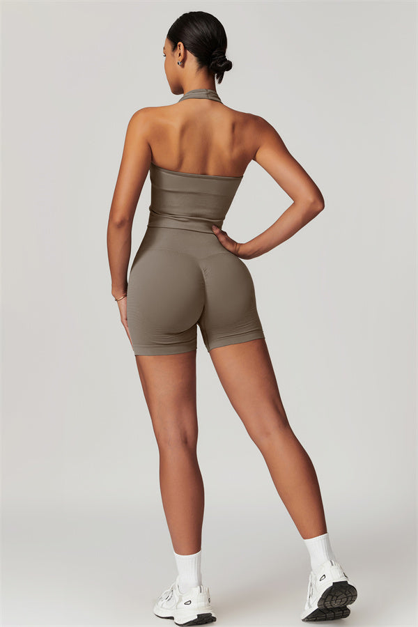 Crafted from seamless knit fabric with a blend of 90% recycled nylon and 10% spandex, this halter top offers a soft, skin-friendly feel with excellent stretch and durability. The waist-cinching design sculpts and flatters your figure, providing a sleek, shapely look without compromising on comfort. Perfect for workouts or casual wear, this versatile halter top delivers style, performance, and a confident fit all in one.