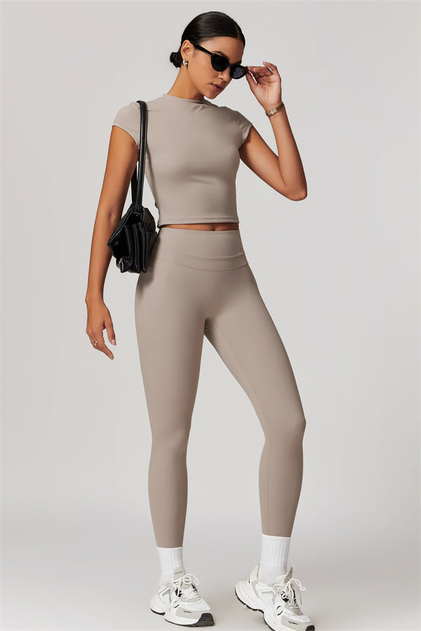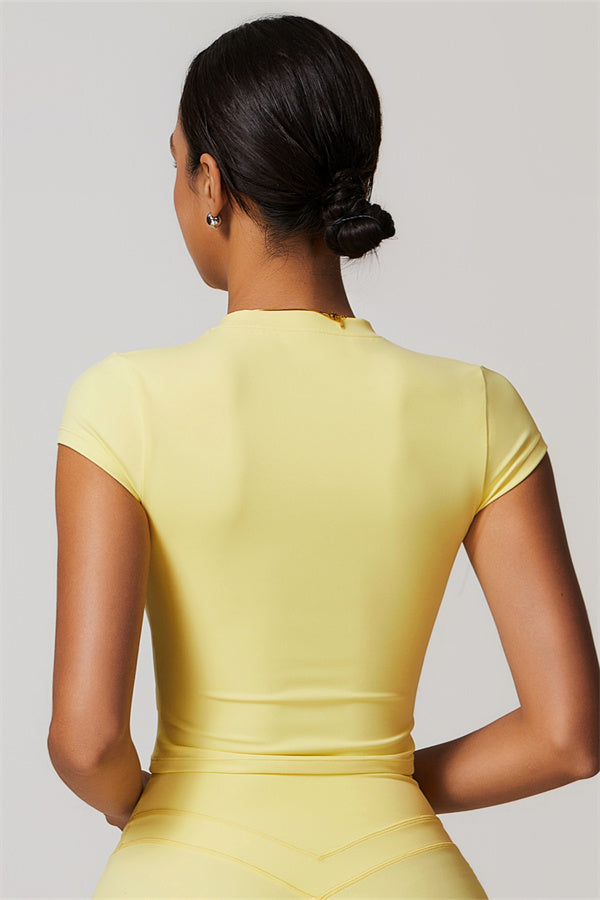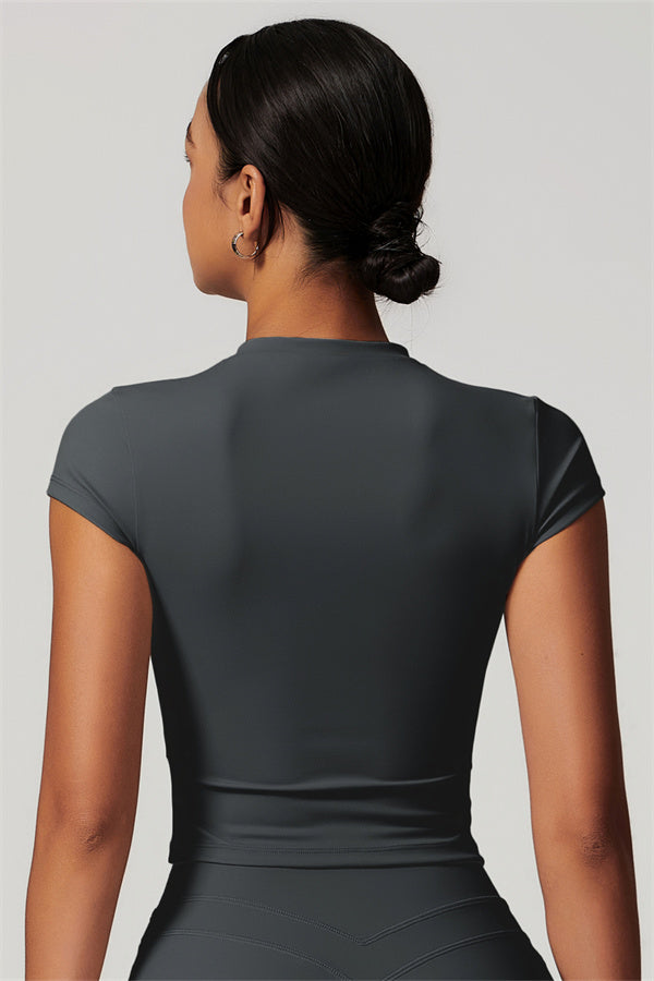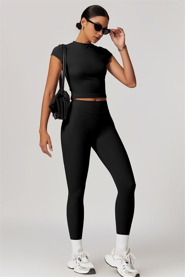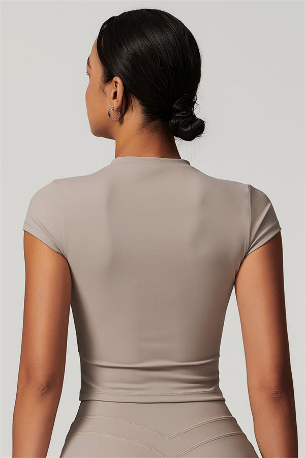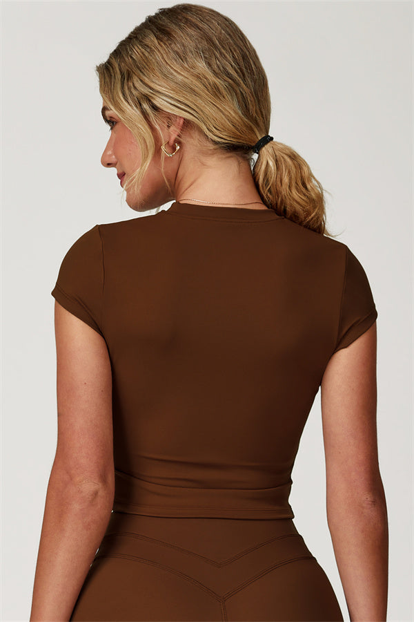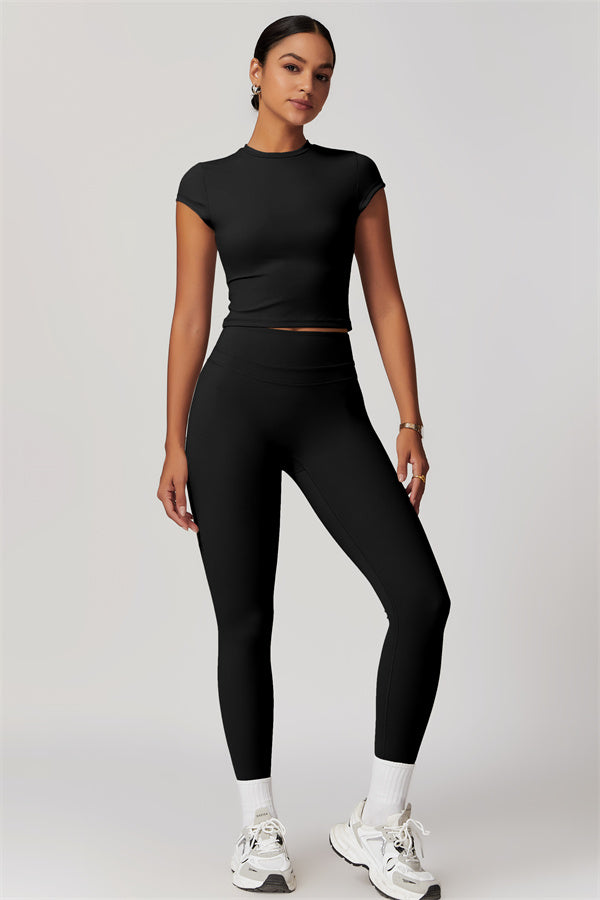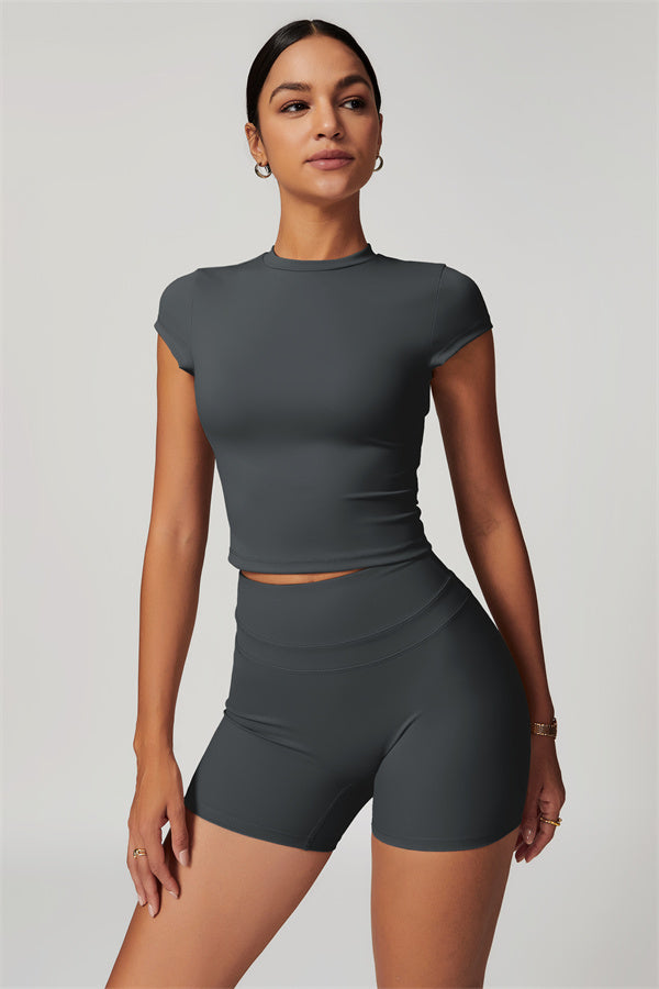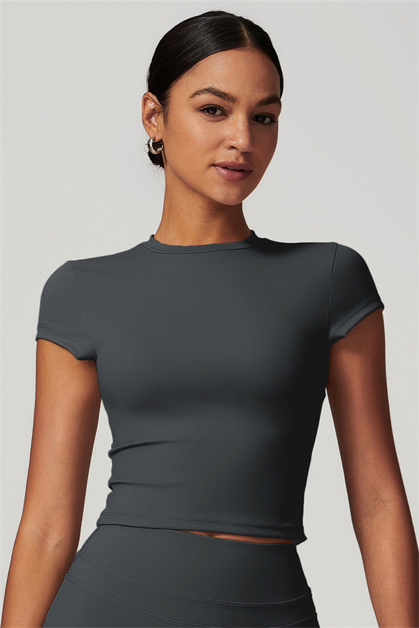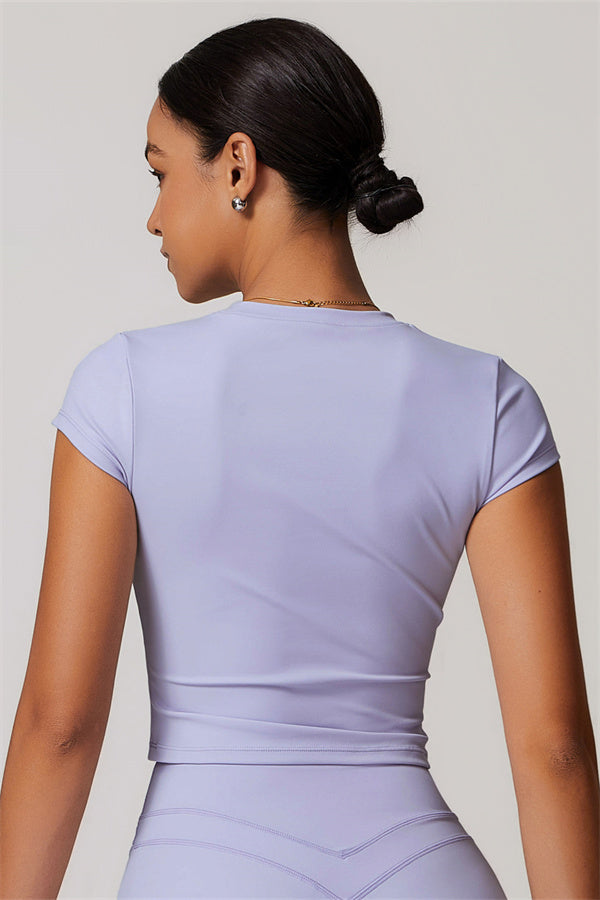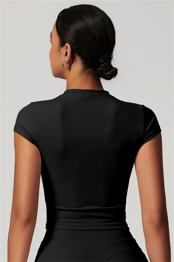 This classic T-shirt blends style with function, making it a versatile choice for activewear or casual outings. Featuring a timeless round neckline, it subtly enhances the neck line, while the charming cap sleeves create a flattering silhouette that emphasizes the shoulders. With a waist-hugging fit, this tee provides a slimming effect and comfortably conceals the midsection for a smooth, streamlined look.