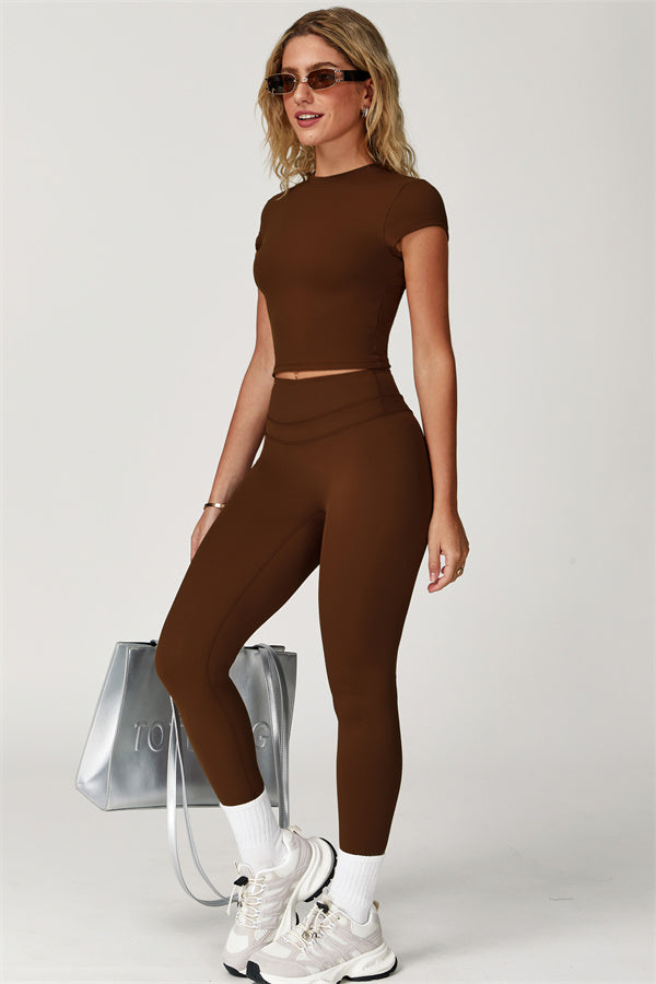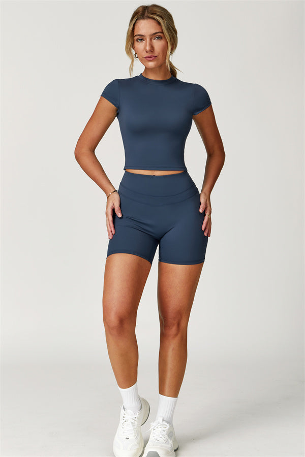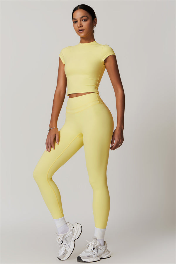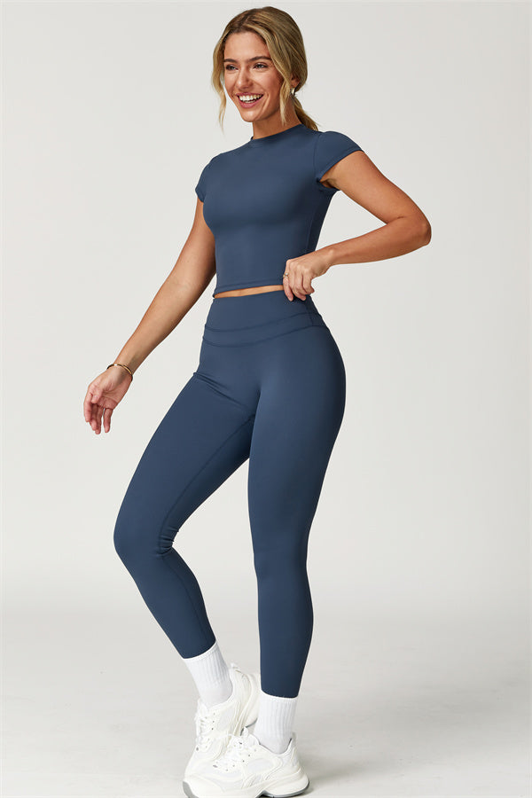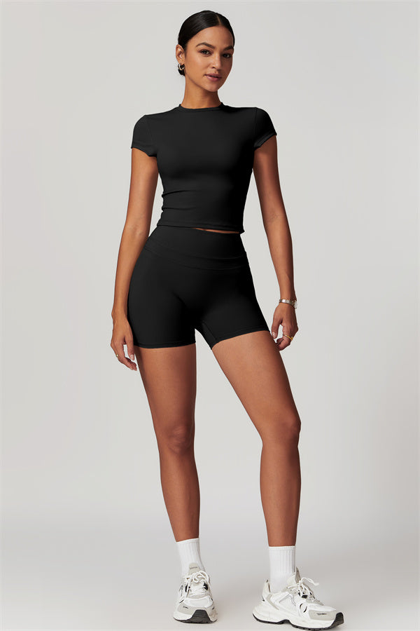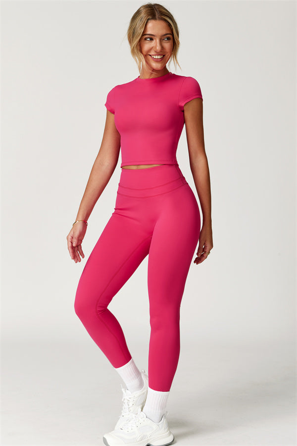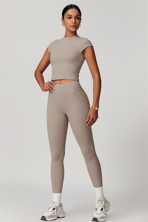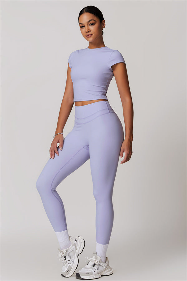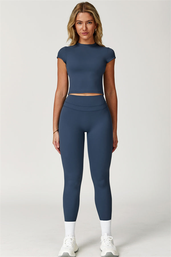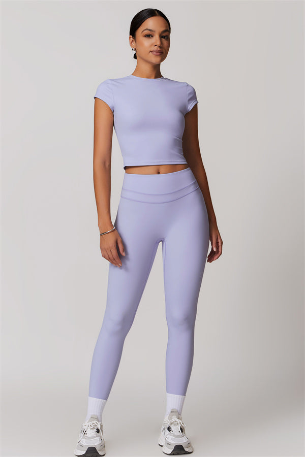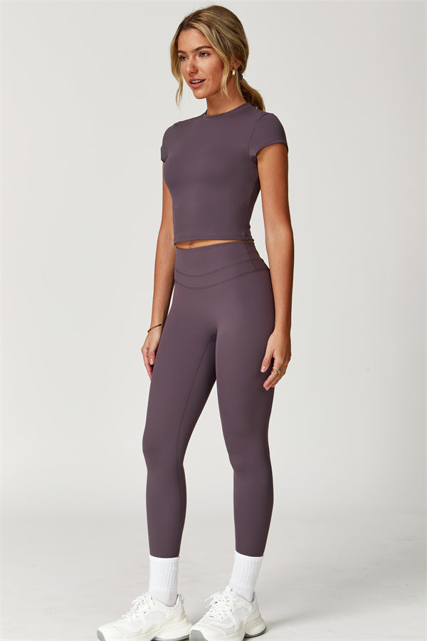 This classic T-shirt blends style with function, making it a versatile choice for activewear or casual outings. Featuring a timeless round neckline, it subtly enhances the neck line, while the charming cap sleeves create a flattering silhouette that emphasizes the shoulders. With a waist-hugging fit, this tee provides a slimming effect and comfortably conceals the midsection for a smooth, streamlined look.