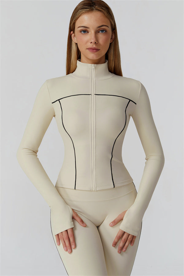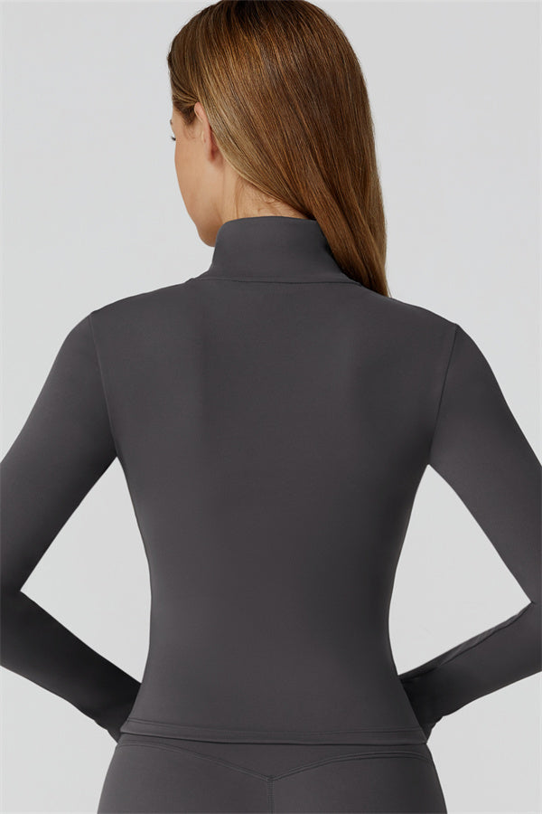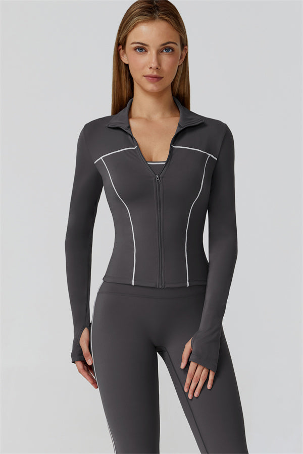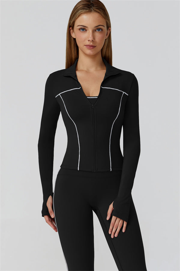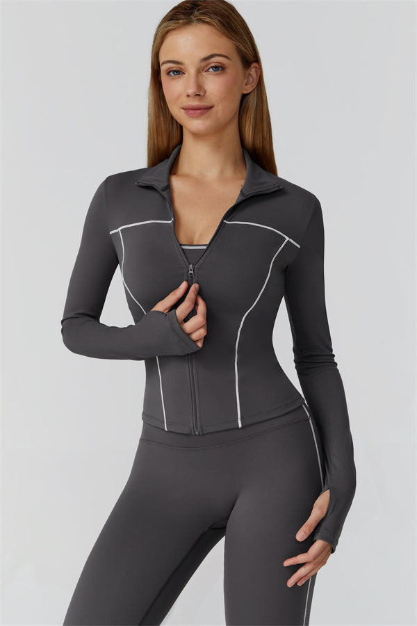 Full-length front zip with stand collar for wind protection