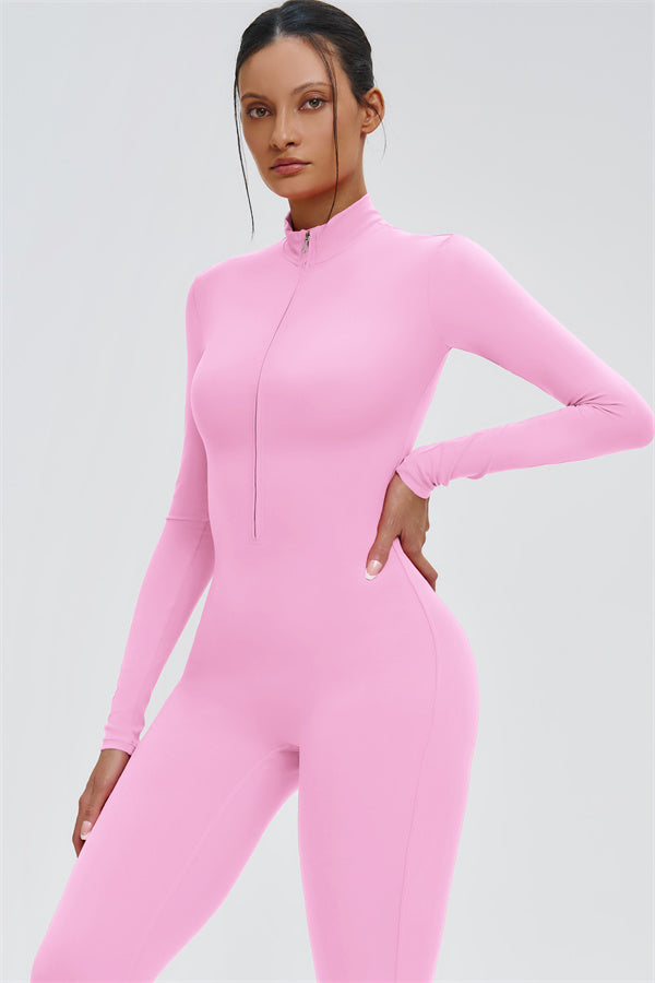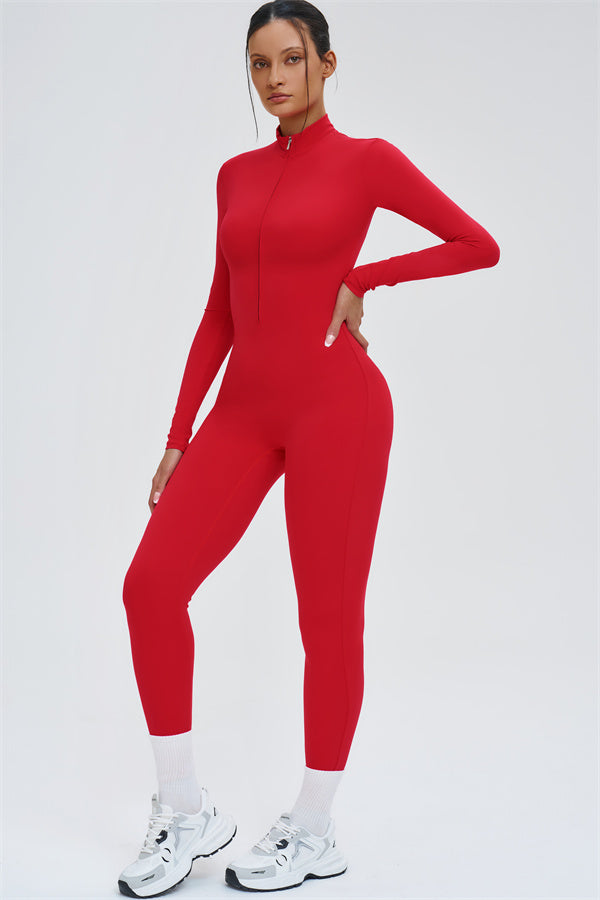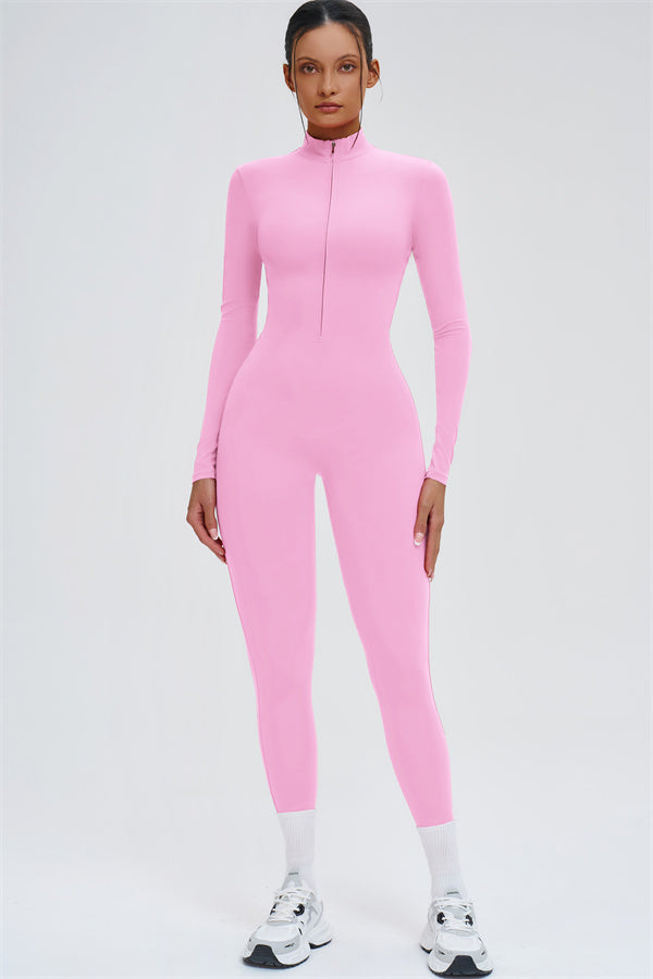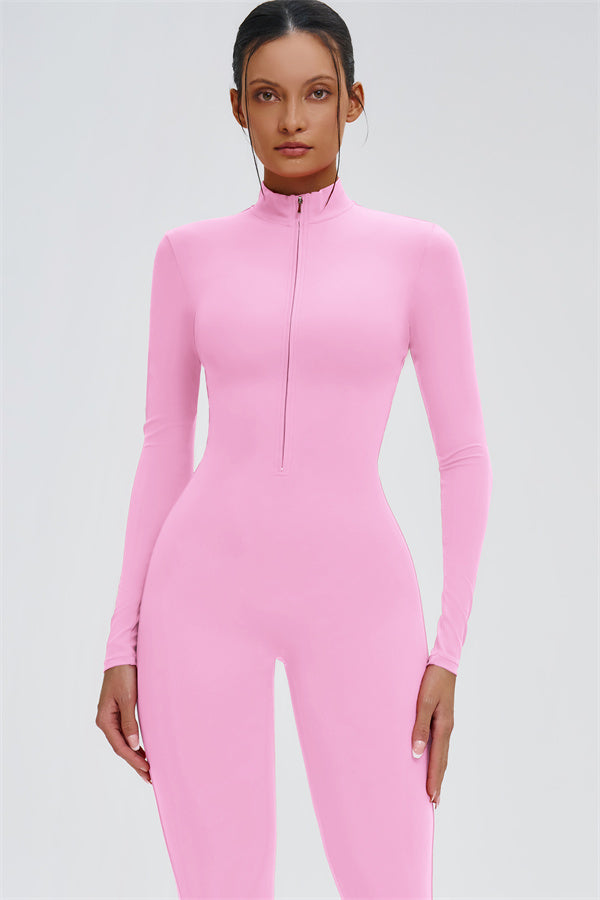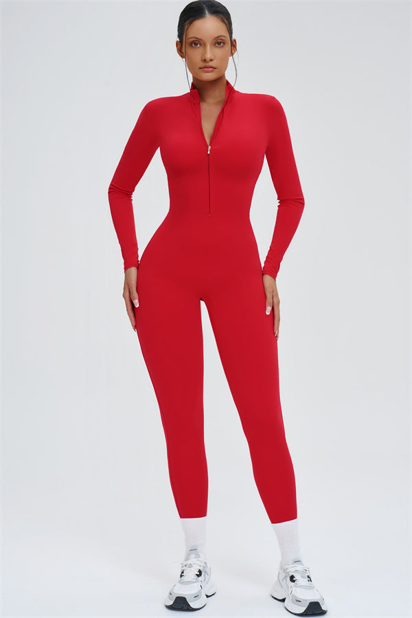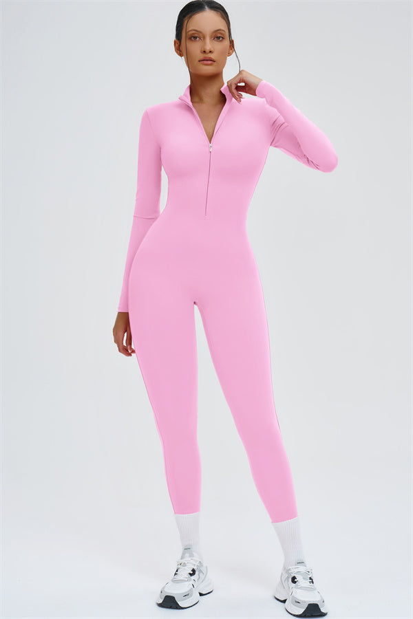 Featuring a stand-up collar and half-zip for easy wear, this long-sleeve jumpsuit showcases your curves with its seamless design. It offers excellent durability, elasticity, and comfort, making it perfect for any workout.