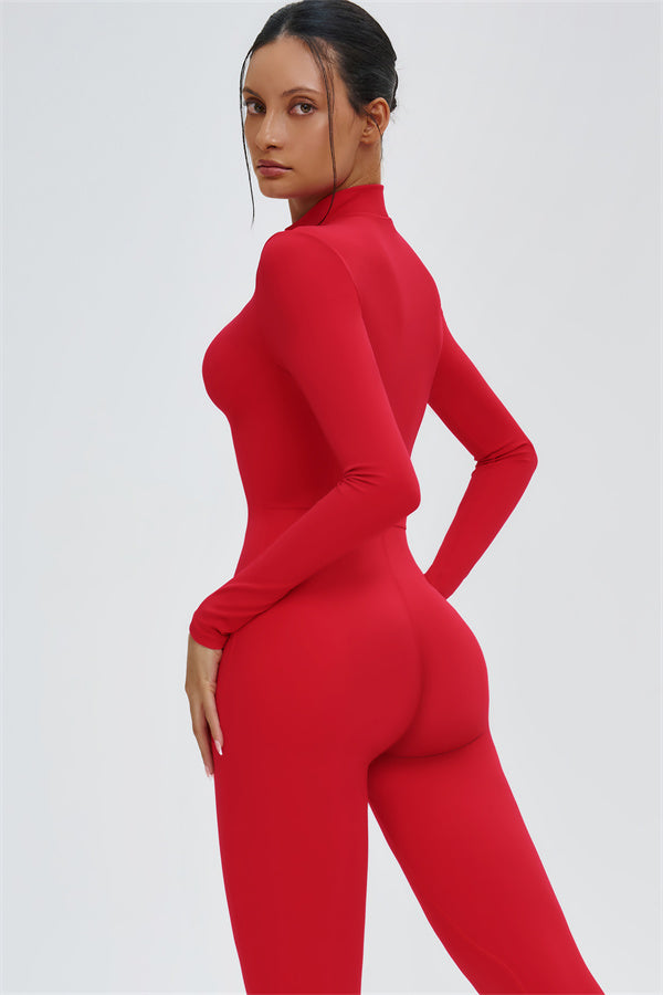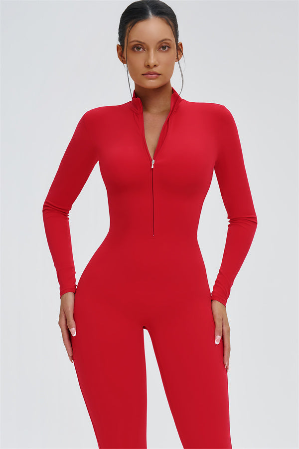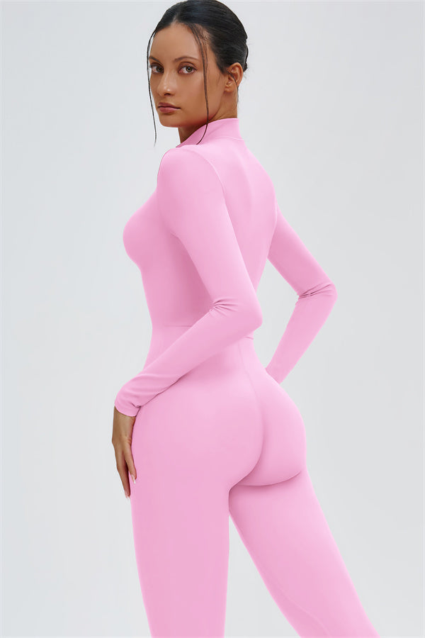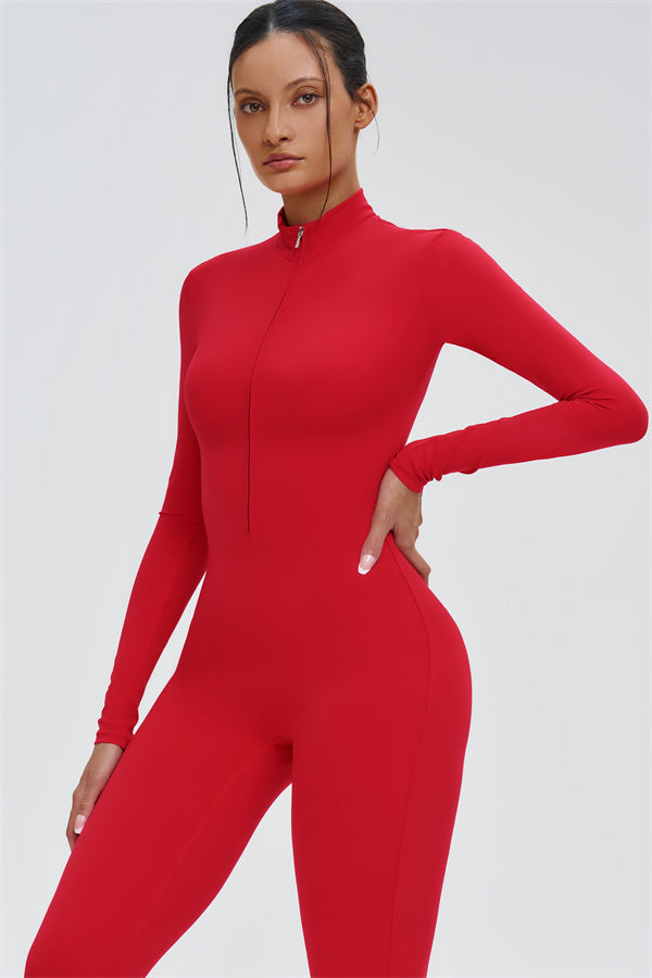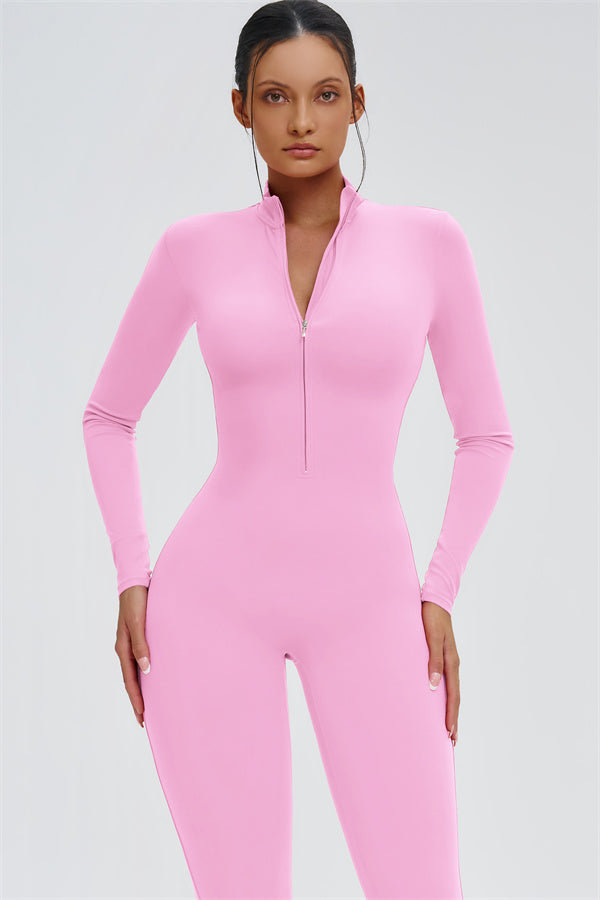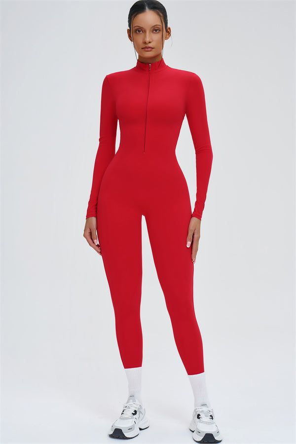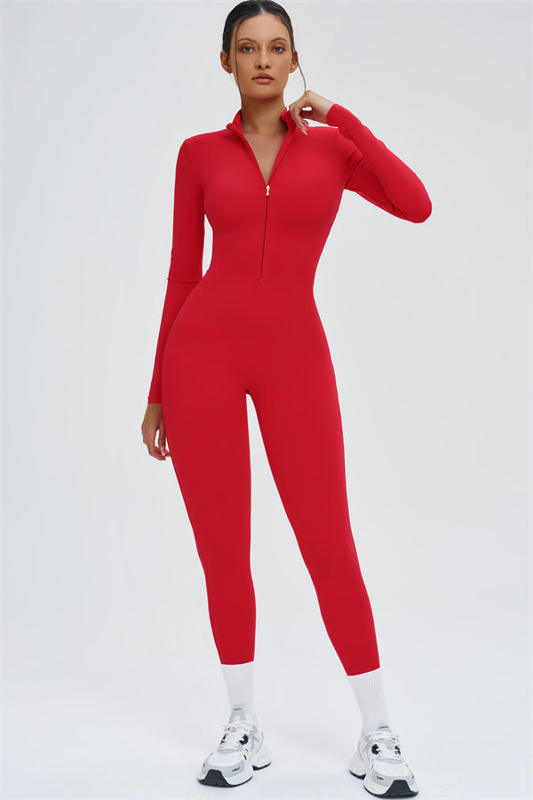 Featuring a stand-up collar and half-zip for easy wear, this long-sleeve jumpsuit showcases your curves with its seamless design. It offers excellent durability, elasticity, and comfort, making it perfect for any workout.