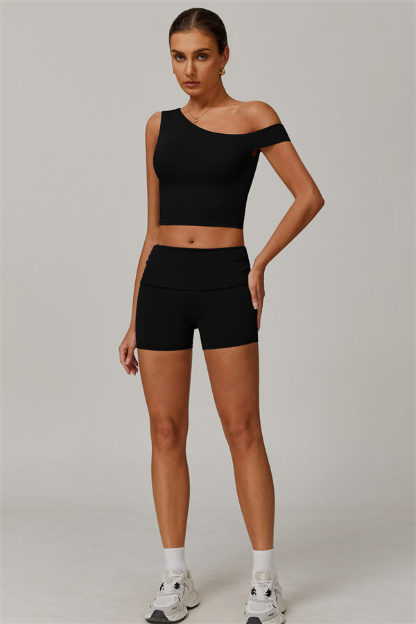 Fresh, functional, and designed to turn heads. The Pearl Set pairs a bold one-shoulder crop top with high-rise shorts to create a confident look for movement or leisure. Made with eco-friendly recycled fabric, this set flatters your figure while keeping things cool and breathable.