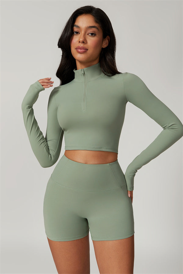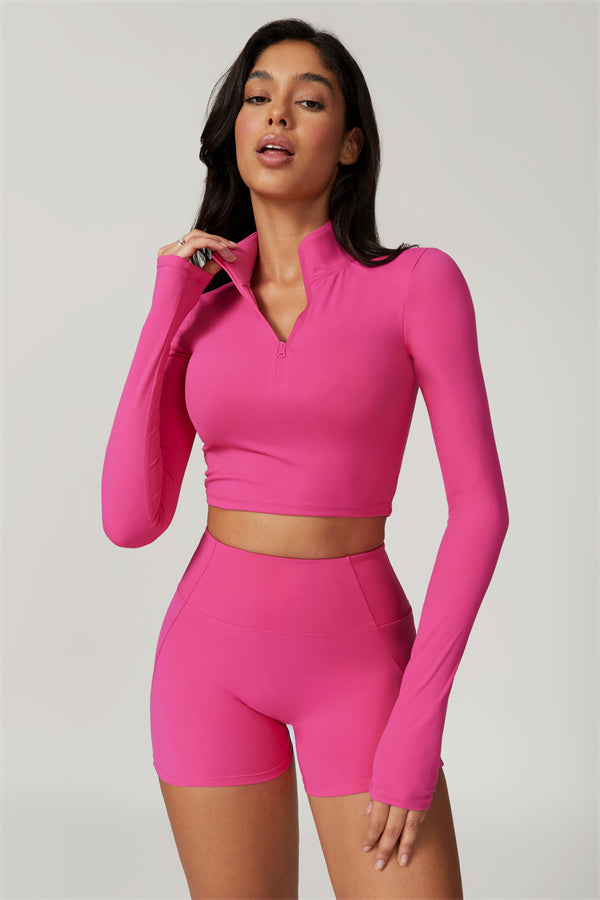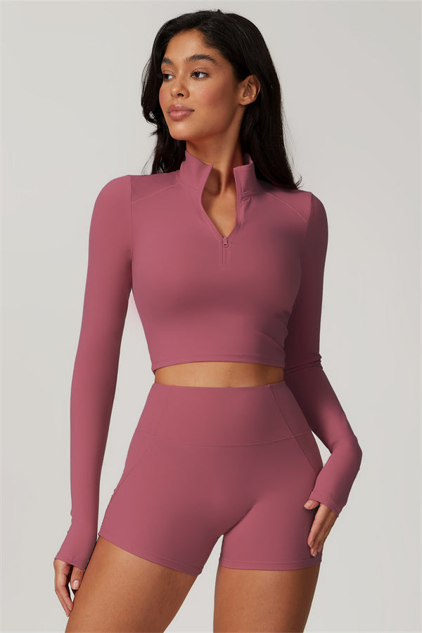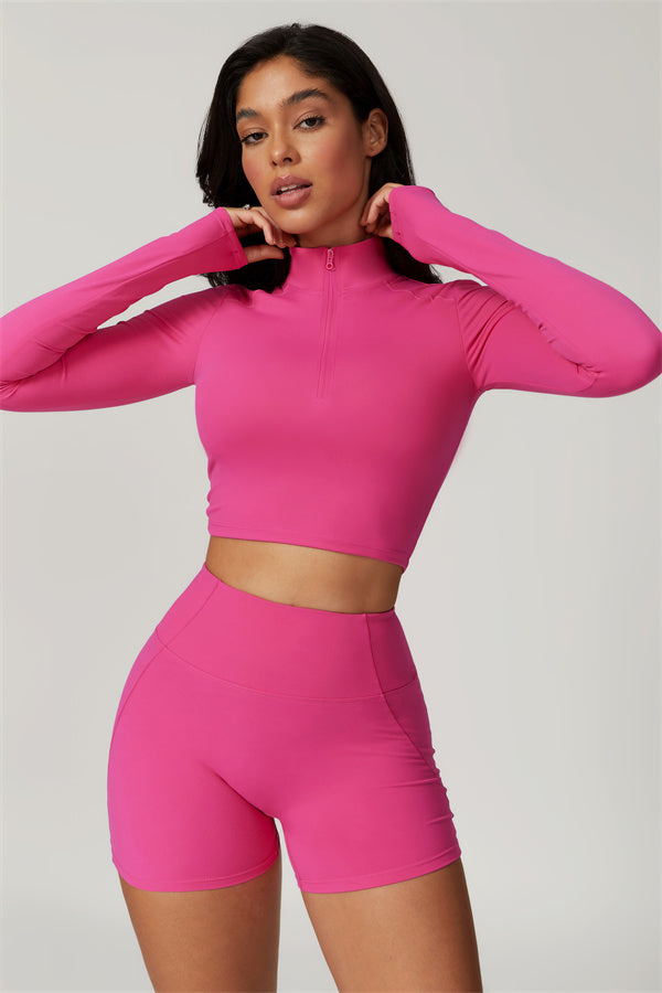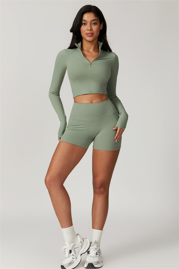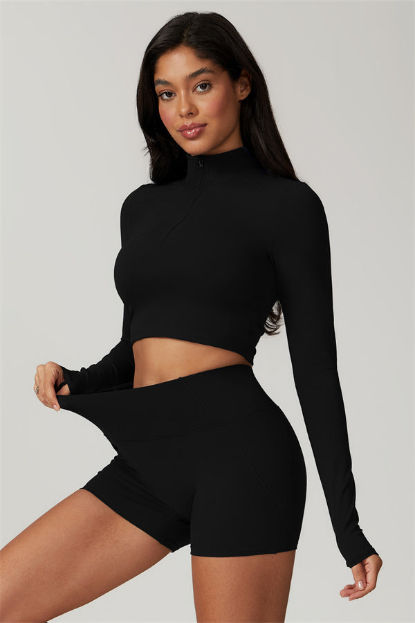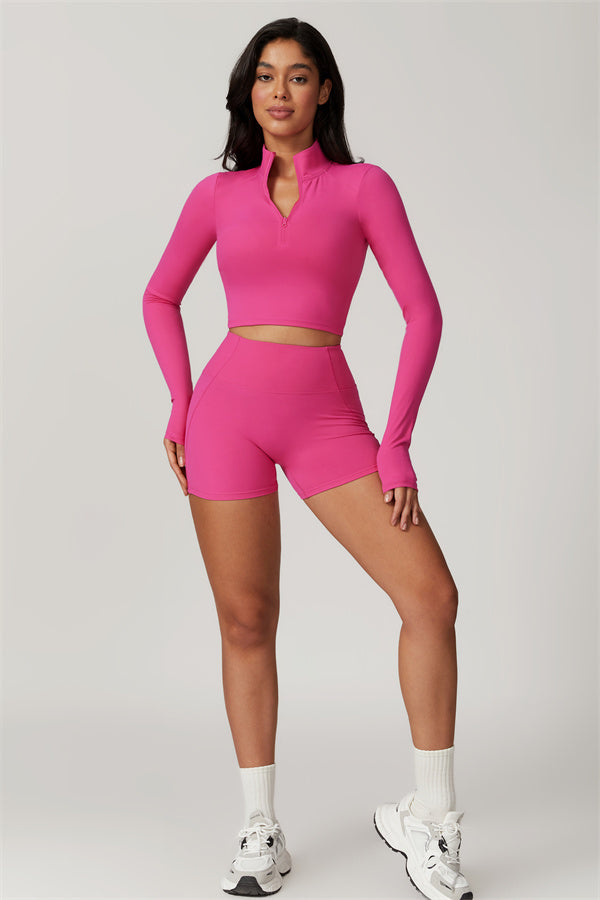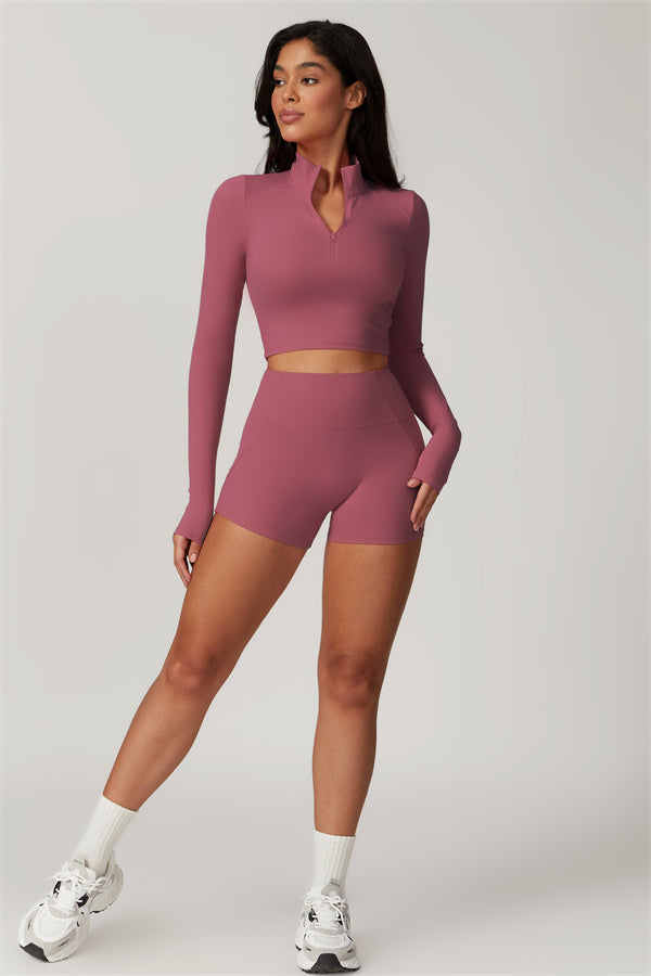 This stylish matching set features a long sleeve top and shorts, designed for both performance and fashion. The top includes a stand-up collar with a half-zip for easy wear and a secure, comfortable fit. It also features built-in thumbholes at the cuffs, preventing sleeves from sliding down during your workout, while ensuring a snug and supportive feel.