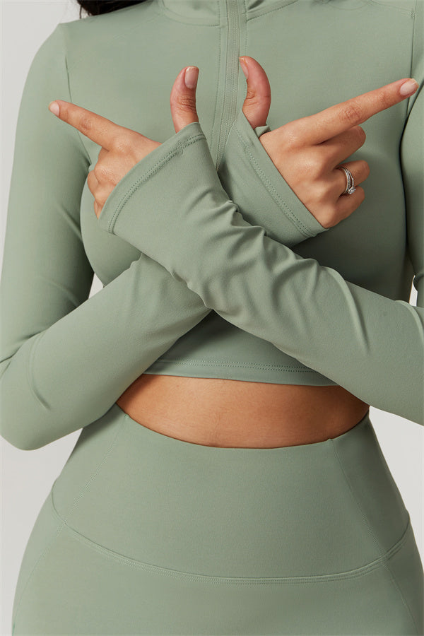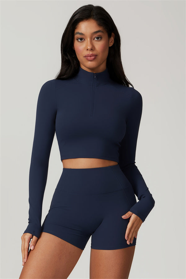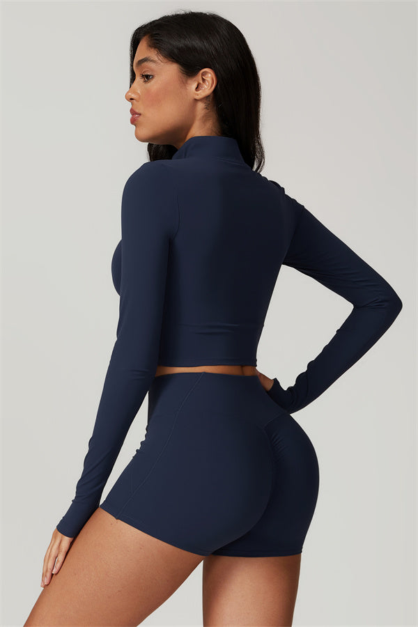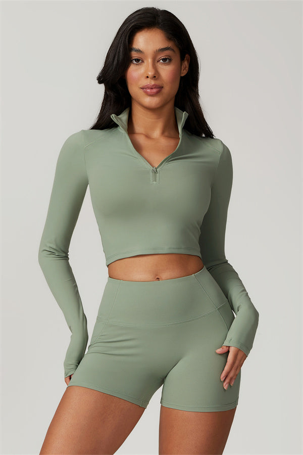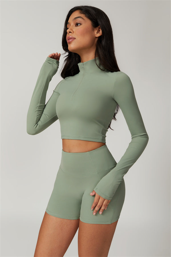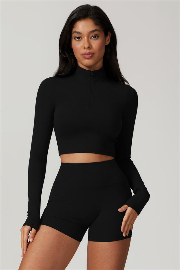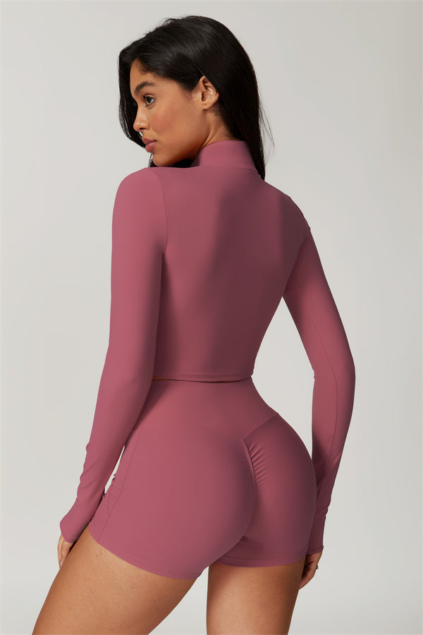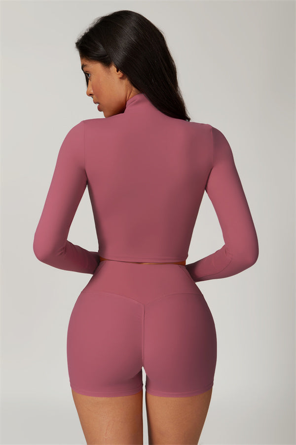 This stylish matching set features a long sleeve top and shorts, designed for both performance and fashion. The top includes a stand-up collar with a half-zip for easy wear and a secure, comfortable fit. It also features built-in thumbholes at the cuffs, preventing sleeves from sliding down during your workout, while ensuring a snug and supportive feel.