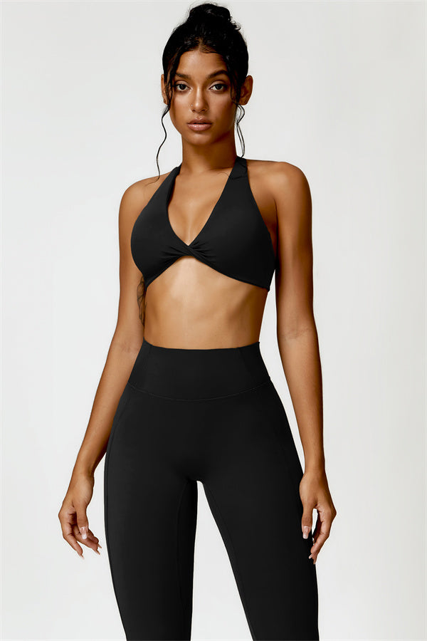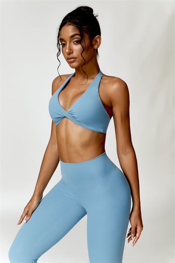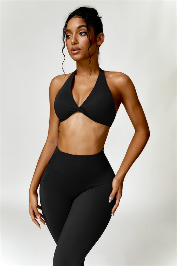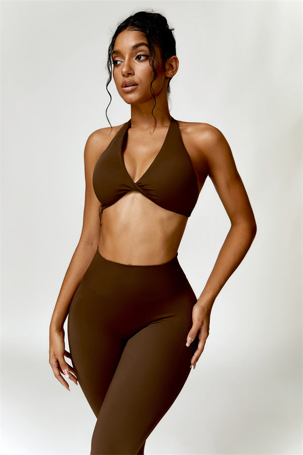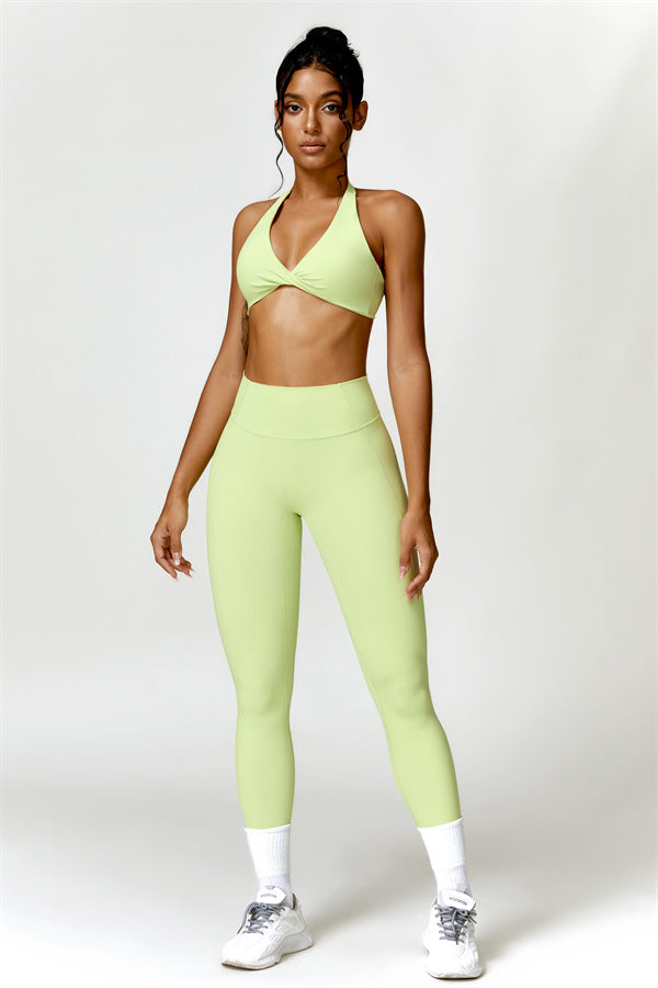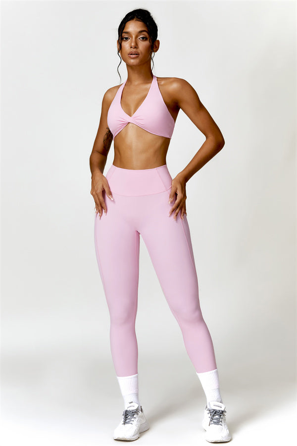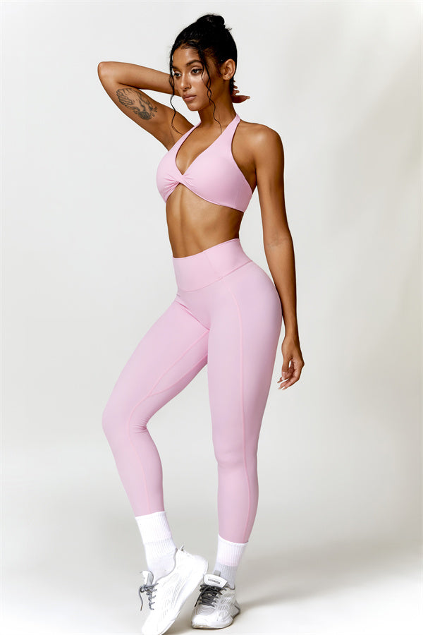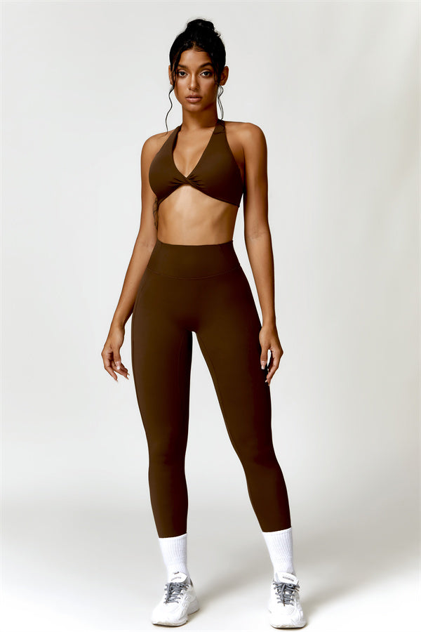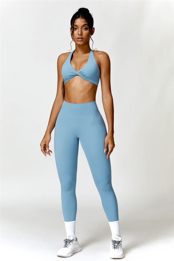 This matching set combines a chic, twisted-front sports bra with high-waisted, figure-enhancing leggings, creating a sleek and stylish look for both workouts and casual wear. The sports bra features a front twist detail for a touch of elegance, while the trapezoid waistband on the leggings is designed to gently sculpt your waist, offering a flattering, secure fit without pinching.