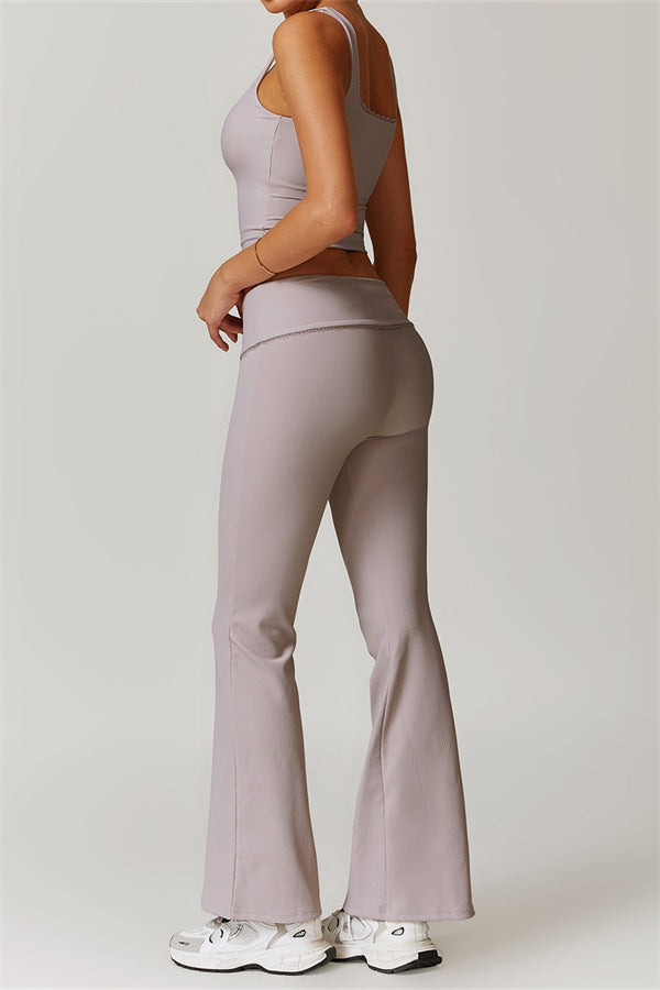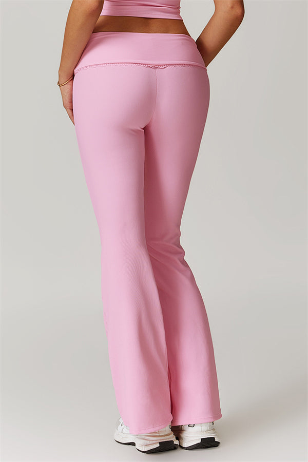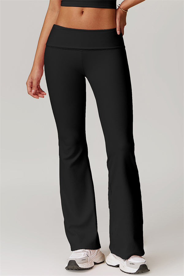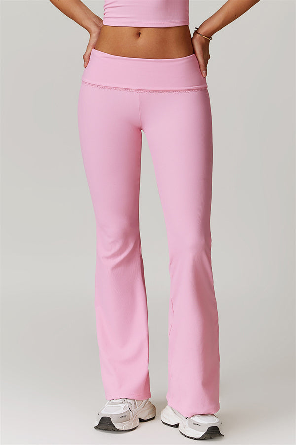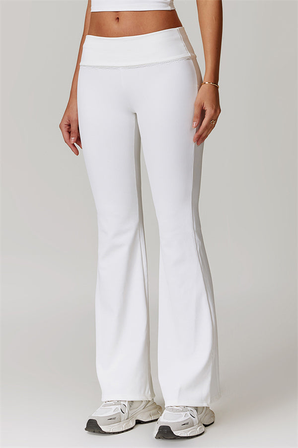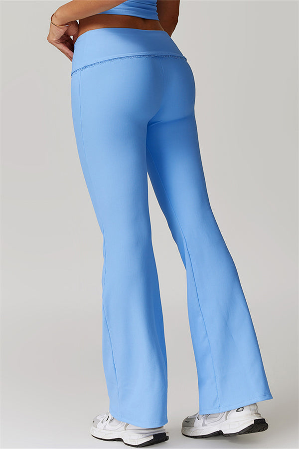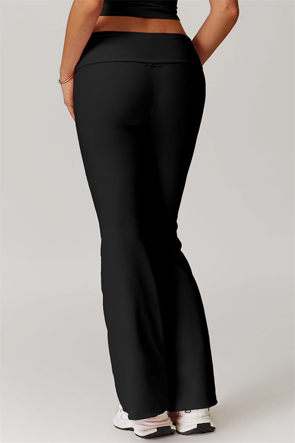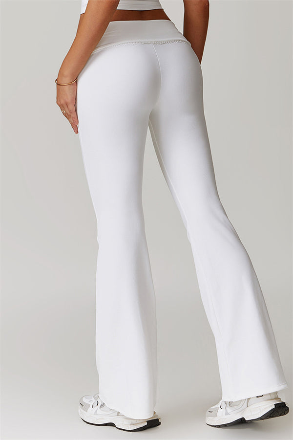 Designed with a ruching fold-over waistband that effortlessly smooths your midsection for a sleek look. The flared pant style beautifully conceals your calves while enhancing your thighs, creating a balanced silhouette. Featuring three-dimensional stitching on the front, these leggings add depth and texture to your outfit.