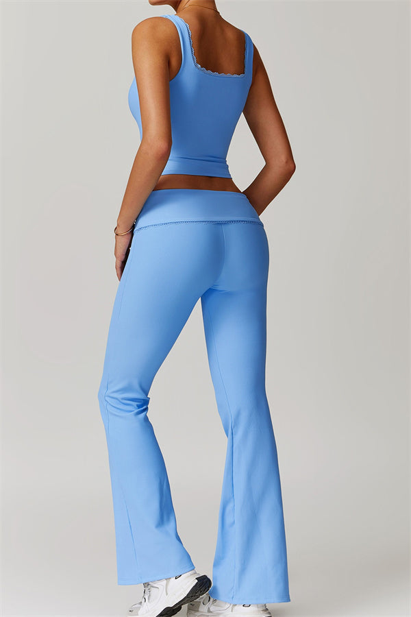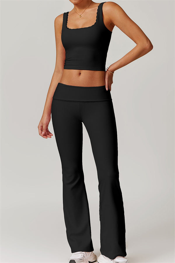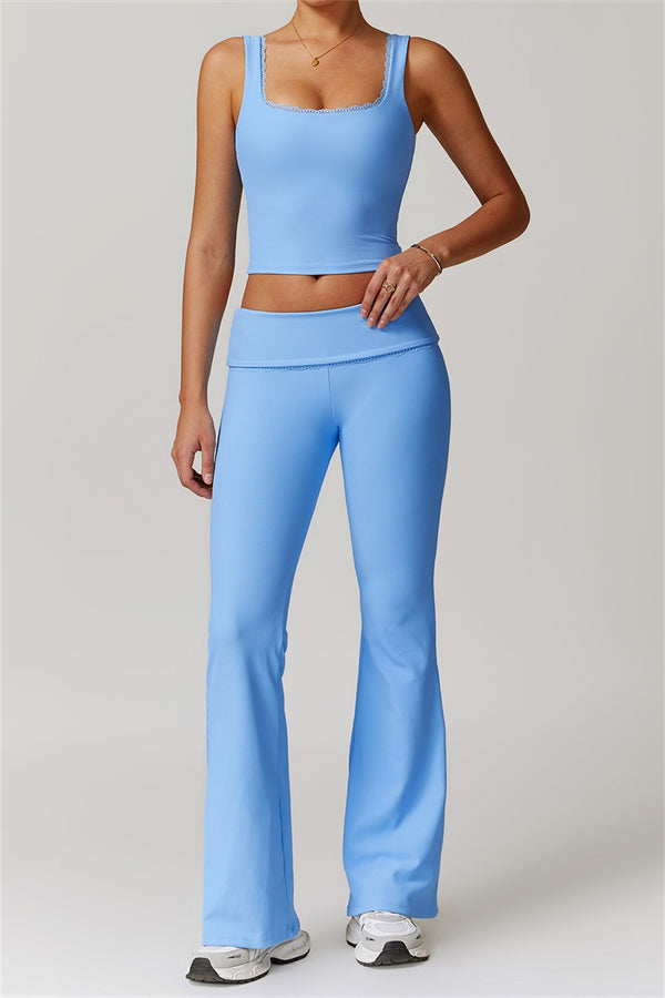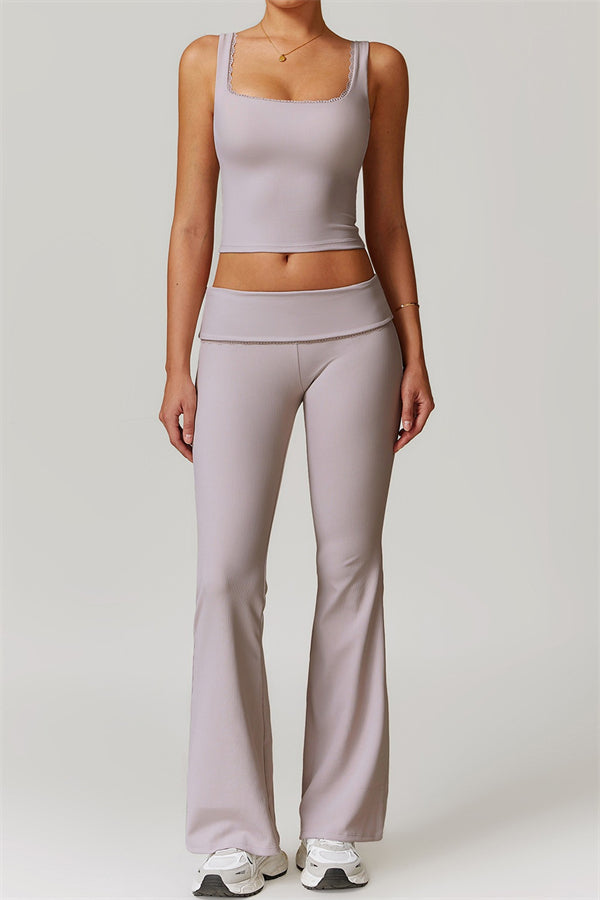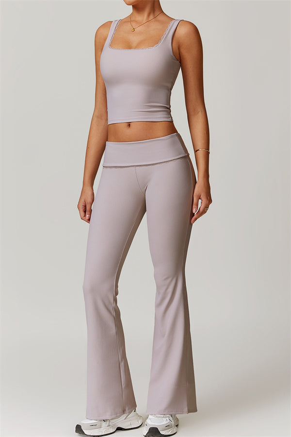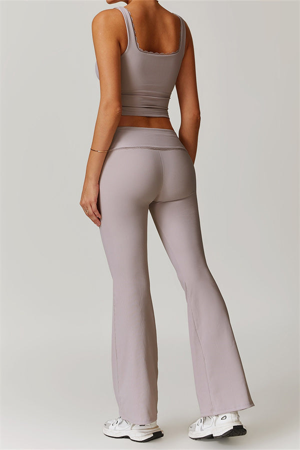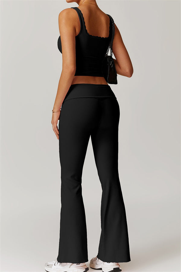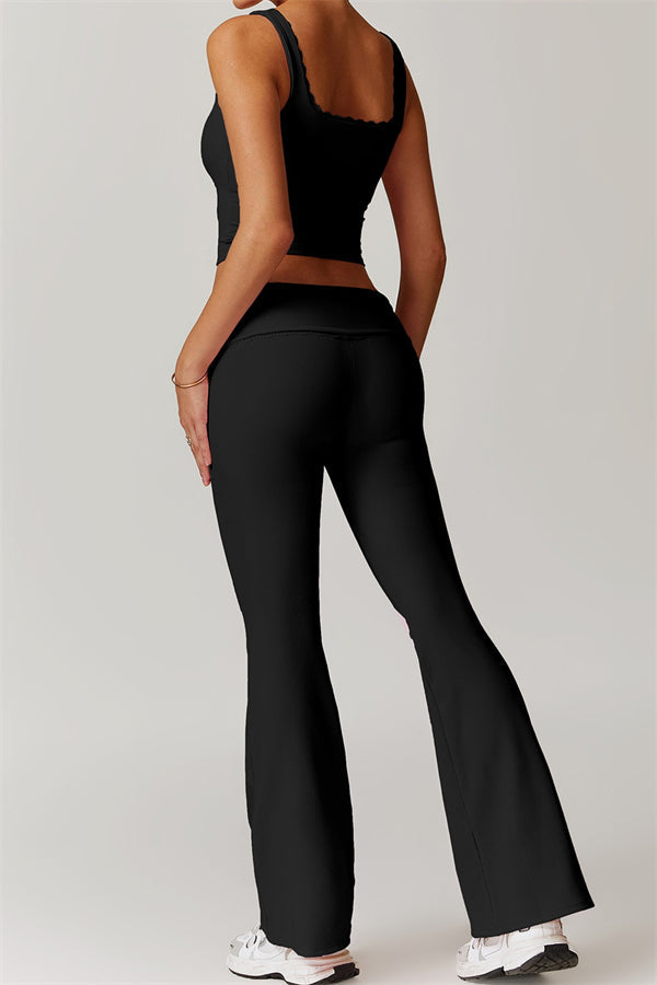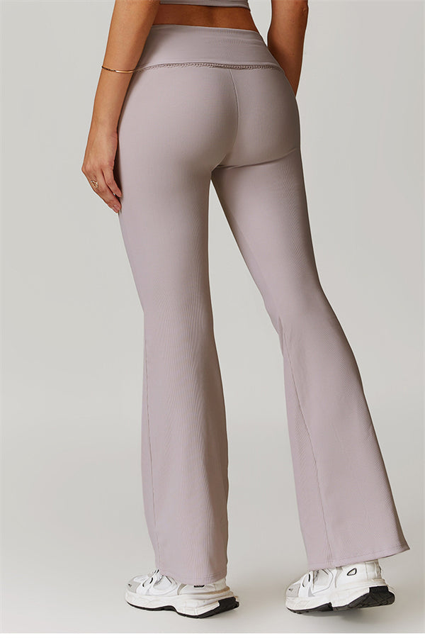 Designed with a ruching fold-over waistband that effortlessly smooths your midsection for a sleek look. The flared pant style beautifully conceals your calves while enhancing your thighs, creating a balanced silhouette. Featuring three-dimensional stitching on the front, these leggings add depth and texture to your outfit.
