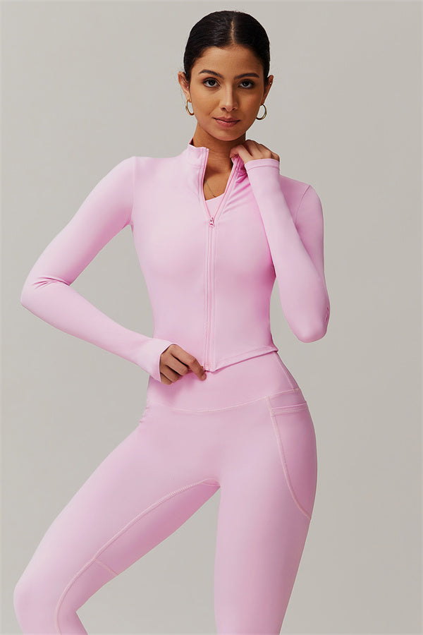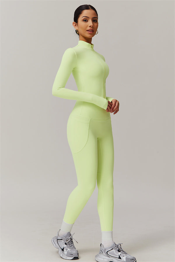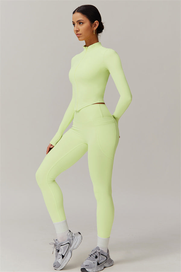 Elevate your activewear game with this sophisticated matching set, featuring a sleek jacket and figure-hugging leggings. The jacket is designed with a stand collar and full-zip closure for adjustable coverage and wind protection, adding a sporty edge to your look. Long cuffs provide slip-resistant comfort, while the V-shaped hemline contours to your body, enhancing your silhouette. Functional side pockets offer convenient storage for your essentials.