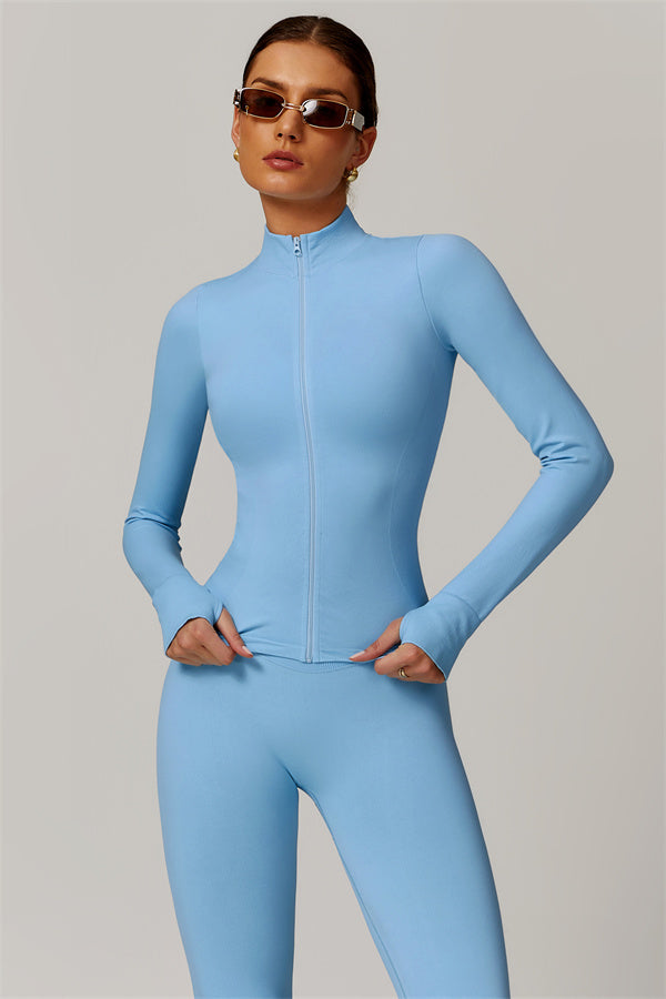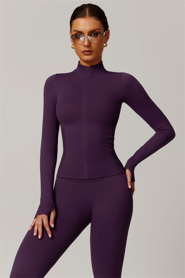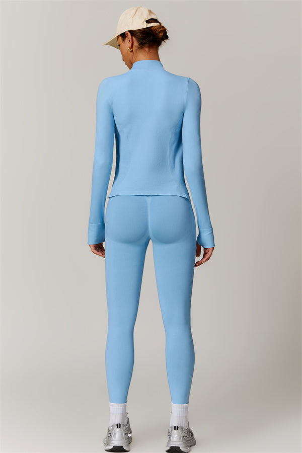Elevate your activewear collection with this sleek matching set, featuring a high-neck zip-up jacket and sculpting high-waisted leggings. The jacket's full-zip design with a high collar offers adjustable coverage and wind resistance, bringing a stylish, athletic edge to your look. Ribbed, cinched waist detailing enhances your natural shape for a slimming effect, while thumbhole cuffs keep sleeves in place and provide extra protection for your hands during any activity.