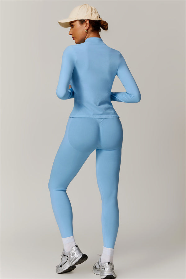 The high-waisted leggings complement the jacket perfectly, with a structured waistband that shapes and smooths your midsection. A lifting seam detail at the back adds flattering definition, accentuating your curves and providing a secure, supportive fit. The triangle gusset allows for unrestricted movement, making this set ideal for high-impact workouts and beyond.