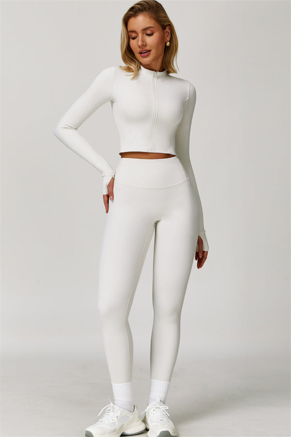 Elevate your activewear game with this premium matching set, featuring a sports bra, cropped jacket, and leggings designed for both performance and style. The sports bra showcases an arched front seam and wide cross-back straps, providing support while highlighting your back beautifully. Pair it with the cropped jacket, crafted with a zip-up stand collar and a waist-length cut, adding a sleek and sporty edge to your look. The leggings feature a seamless front, avoiding any visible lines, with ruched detailing at the back for a flattering lift and contoured shape.