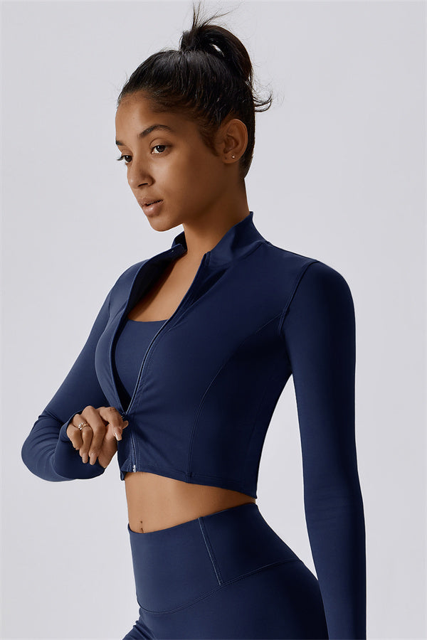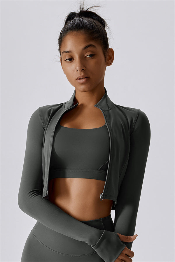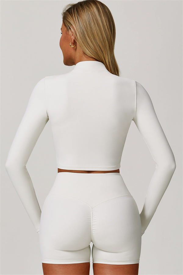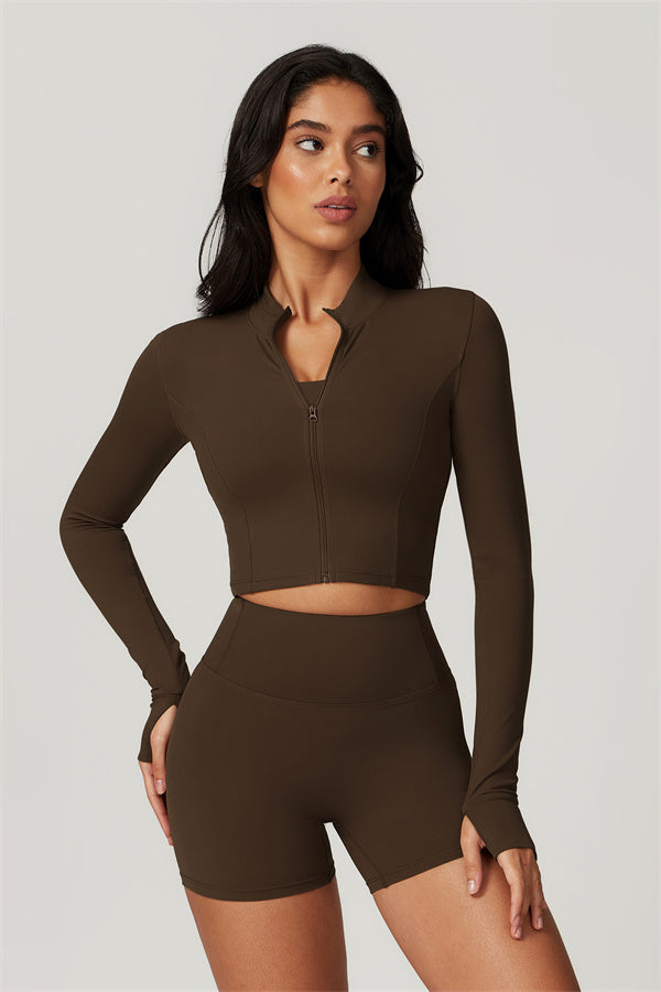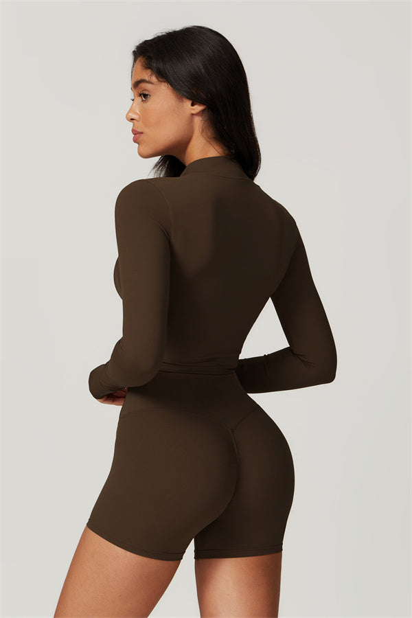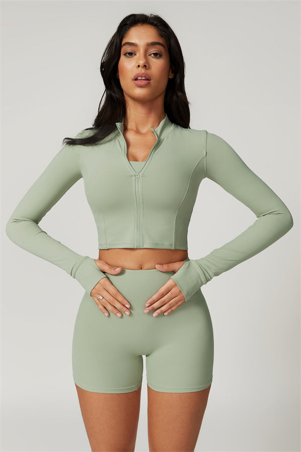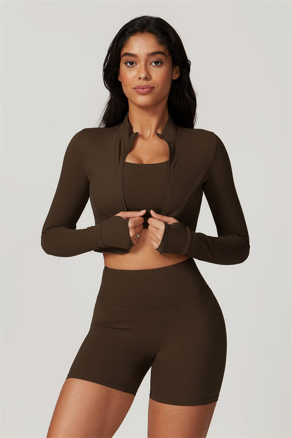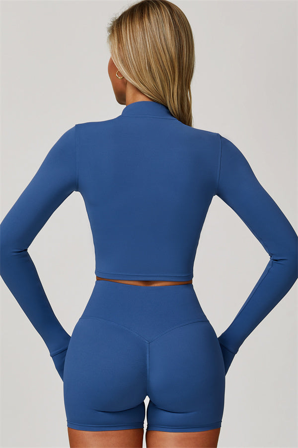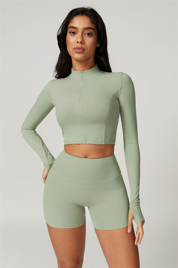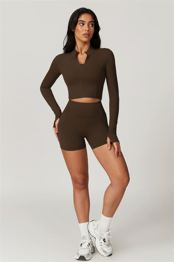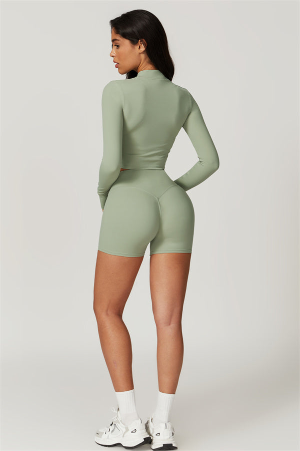 This stylish matching set includes a jacket, sports bra, and shorts, designed to offer both comfort and performance. The jacket features a modern high collar with a full zipper, giving you the flexibility to adjust your look and stay cozy during workouts or casual outings. The wide crisscross straps on the back highlight your shoulders and create a flattering silhouette. Its curved structure on the front accentuates your figure, while the pleated details on the back shape and enhance your curves.