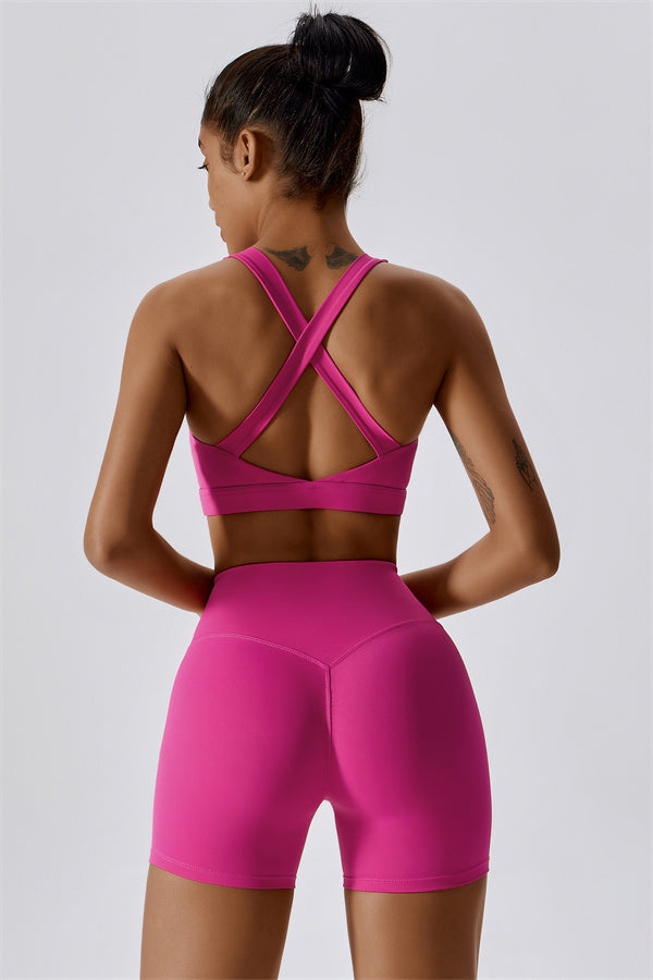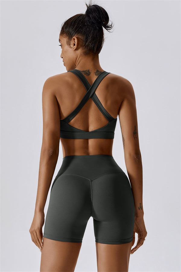 Introducing the ultimate combination of style and comfort – this matching set, which includes a sports bra and shorts, is designed to support you through every workout. The sports bra features a curved structure that enhances your bust, providing a beautifully sculpted, full shape. Its seamless front design ensures freedom of movement without any restrictions, making it perfect for a variety of activities. The set is crafted from a soft, skin-friendly fabric that feels as good as it looks.