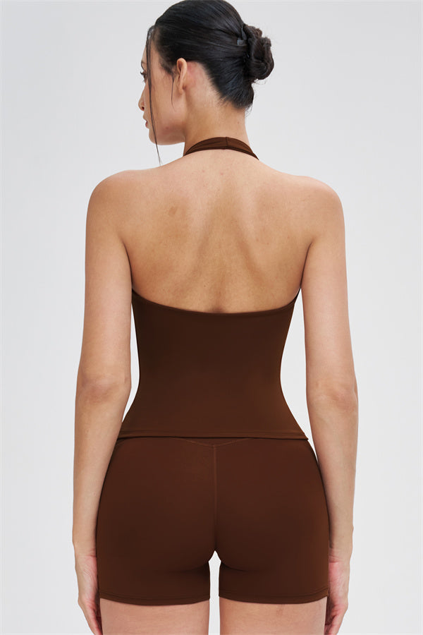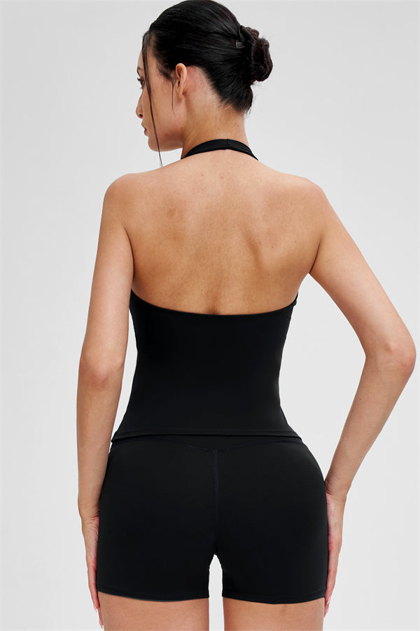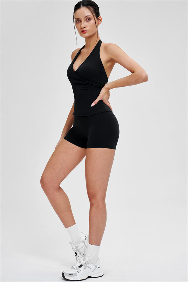 Cross-over V-neck halter design enhances shoulder and neck lines