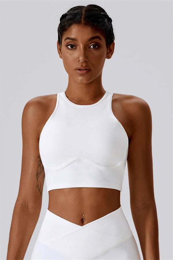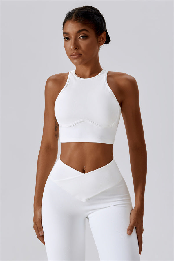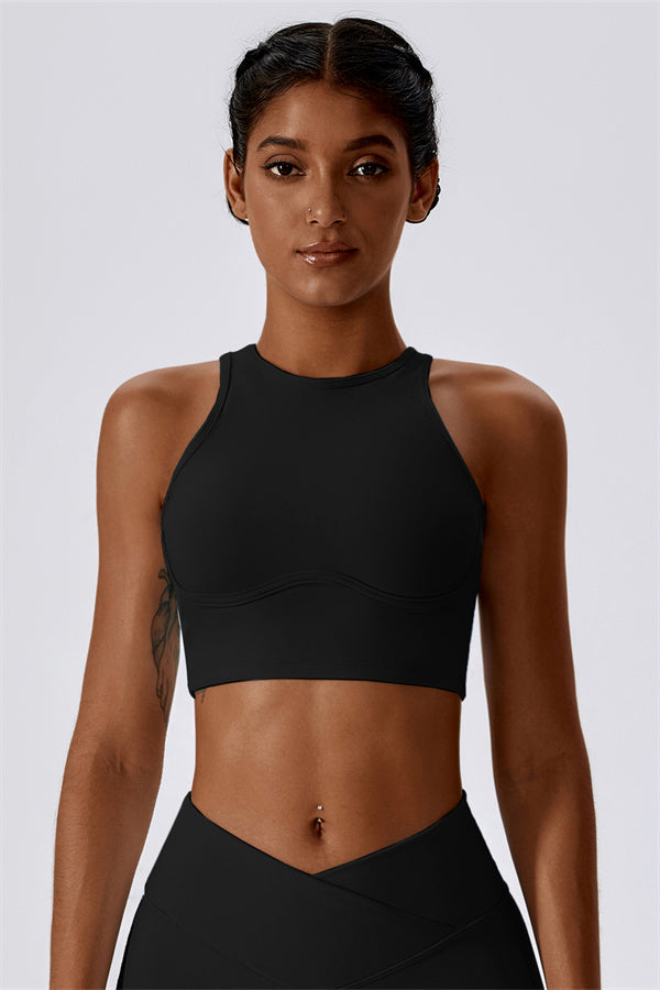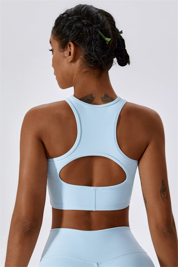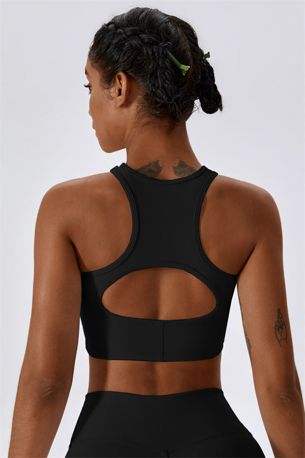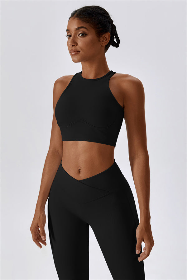 Featuring a vest-style front with a classic round neckline. The racerback design beautifully enhances your back's contours, ensuring you look great while you work out. Made from a durable fabric that resists deformation, this bra offers four-way stretch for optimal movement.