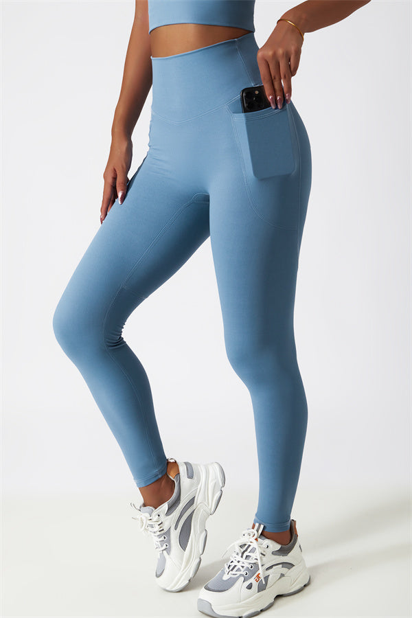 This matching set features a chic sports bra and leggings designed to elevate your activewear collection. The sports bra boasts an asymmetrical, diagonal single-shoulder design for a modern, stylish look. The leggings are crafted with a flattering side pocket detail, adding both practicality and enhancing your curves for a peachy shape.