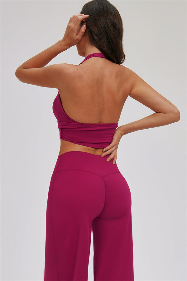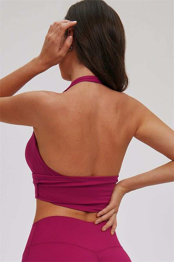 Crop Top: Cross-over V-neck halter design that flatters the shoulders and elongates the neck