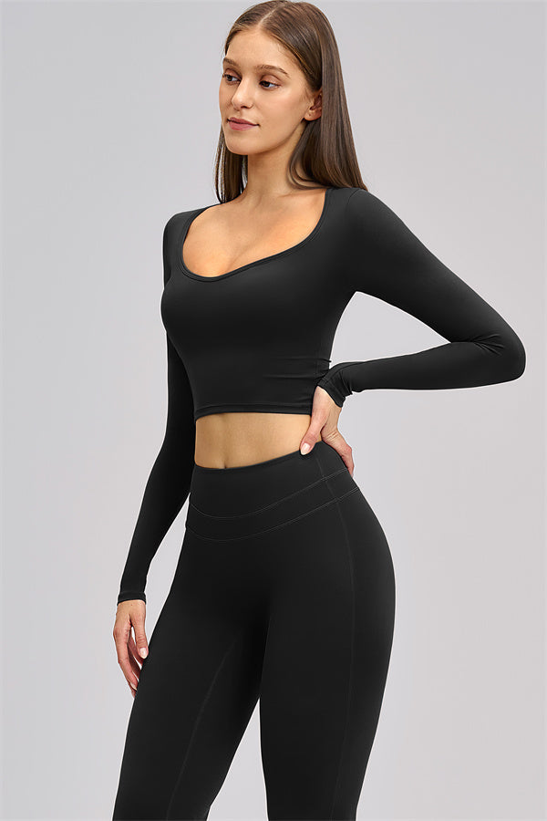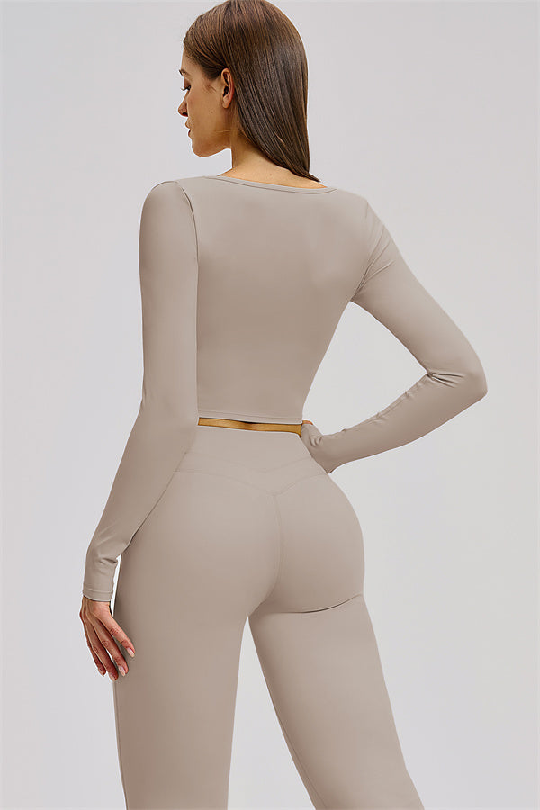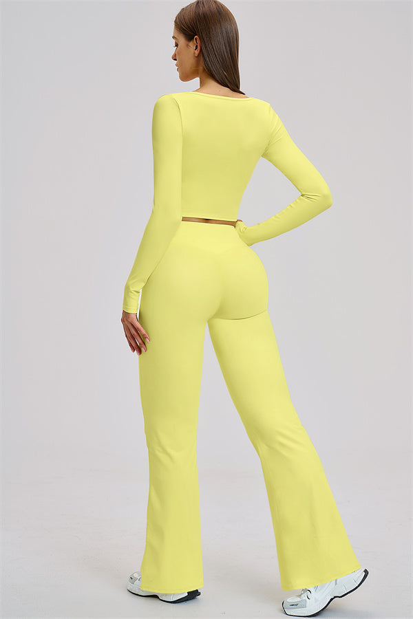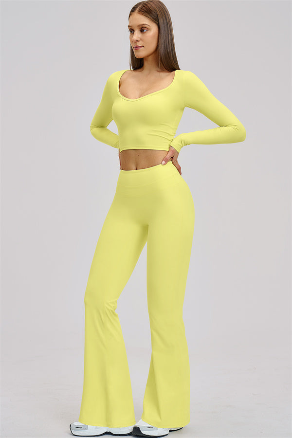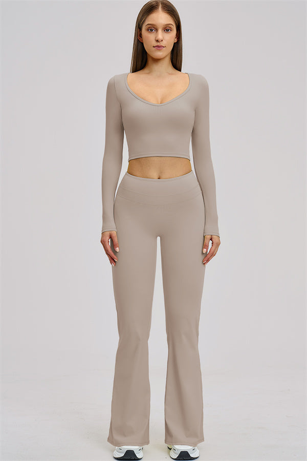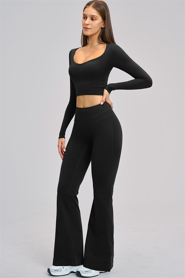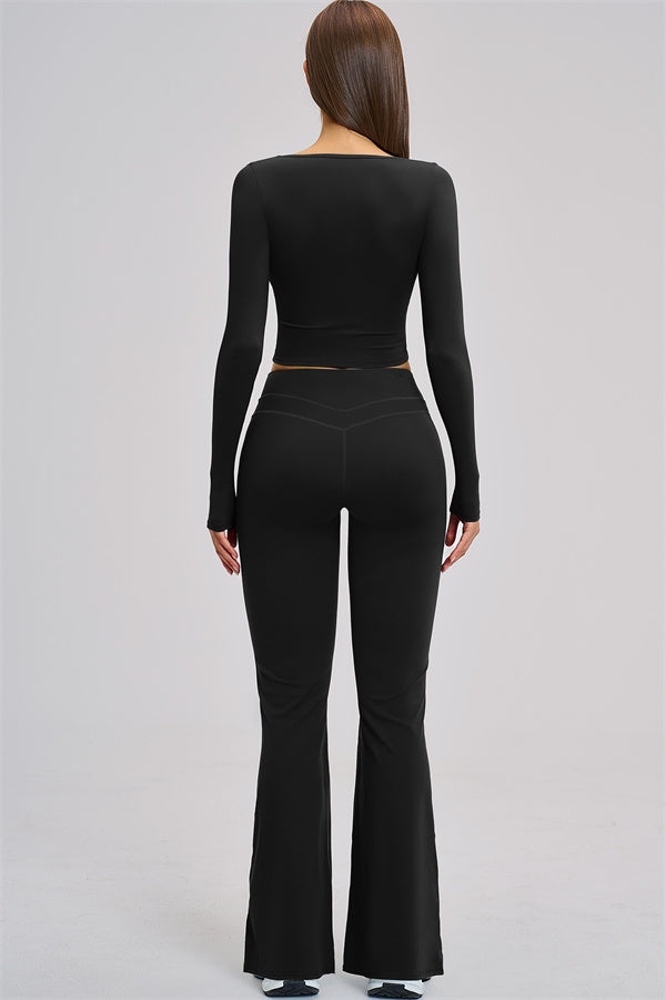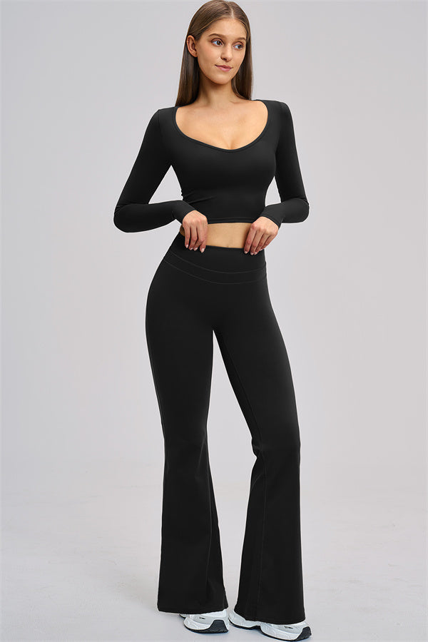Designed for both performance and style, the Stride 2-Piece Set combines a flattering long sleeve top with sculpting flared leggings. Perfect for running, outdoor workouts, or everyday athleisure, this set enhances your silhouette while keeping you comfortable and confident.