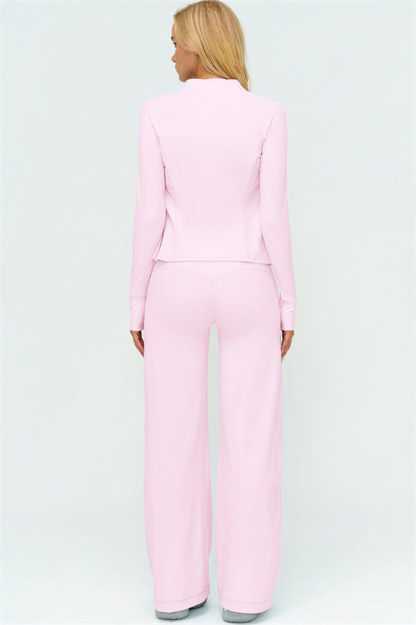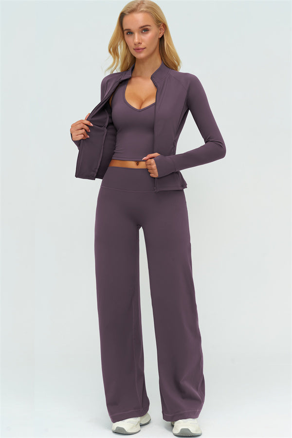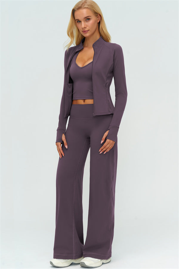 The Twirl Zip Jacket, Halter Tank Top & New Straight Leg Pants 3-Piece Set – a versatile and stylish set designed for workouts, outdoor activities, and casual everyday wear.