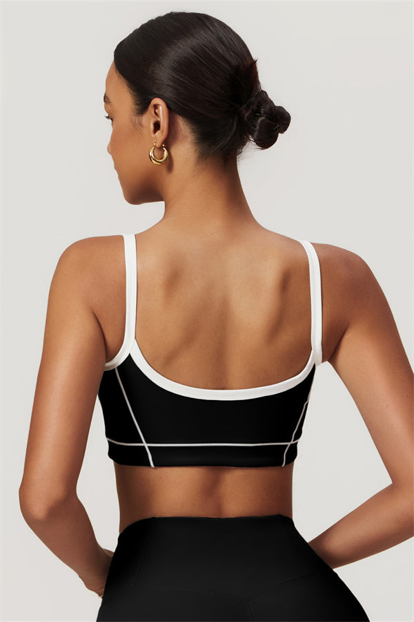 This sports bra features bold color-block stitching with striking white 3D lines that create a rich, layered effect, elevating both the design and structure. The large U-shaped back is designed to accentuate your natural curves and reveal your beautiful shoulder blades, adding a touch of elegance to your athletic look.